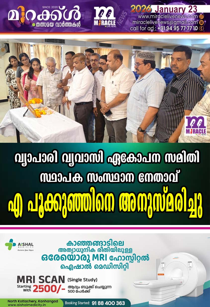 കാഞ്ഞങ്ങാട്: വ്യാപാരി വ്യവാസി ഏ കോപന സമിതി സ്ഥാപക സംസ്ഥാന നേതാവ് കാഞ്ഞങ്ങാട് മര്ച്ചന്റ്സ് അ സോസിയേഷന്റെ രുപീകരണം ത്തൊട്ട് ഭാരവാഹിത്വം വഹിച്ച നേതാവുമായിരുന്ന ഏ പുക്കുഞ്ഞിന്റെ പതിനെട്ടാം ചരമ വാര്ഷികം മര്ച്ചന്റ്സ് അസോസിയേഷന് നേതൃത്വത്തില് ആചരിച്ചു. പ്രത്യേക പ്രാര്ഥനയും പുഷ്പാര്ച്ചനയുമുണ്ടായി. അനുസ്മരണ യോഗത്തില് പ്രസിഡന്റ് സി.കെ ആസിഫ് അധ്യക്ഷത വഹിച്ചു. ജന.സെക്രട്ടറി ഐശ്വര്യ കുമാരന്, ട്രഷറര് ആസിഫ് മെ ട്രോ, ടി മുഹമ്മദ് അസ്ലം, ഗിരീഷ് നായക്ക്, കെ.വി കുഞ്ഞികൃഷ്ണന്, ഖയ്യൂം പൂക്കുഞ്ഞ്, രാമകൃഷ്ണന് അമൃത, കെ.വി കുഞ്ഞികൃഷ്ണന്, പ്രസന്ന ചന്ദ്രന്, ഏ സുബൈര്, ഷെരീഫ് ഫ്രൈം എന്നിവര് സംബന്ധിച്ചു.
