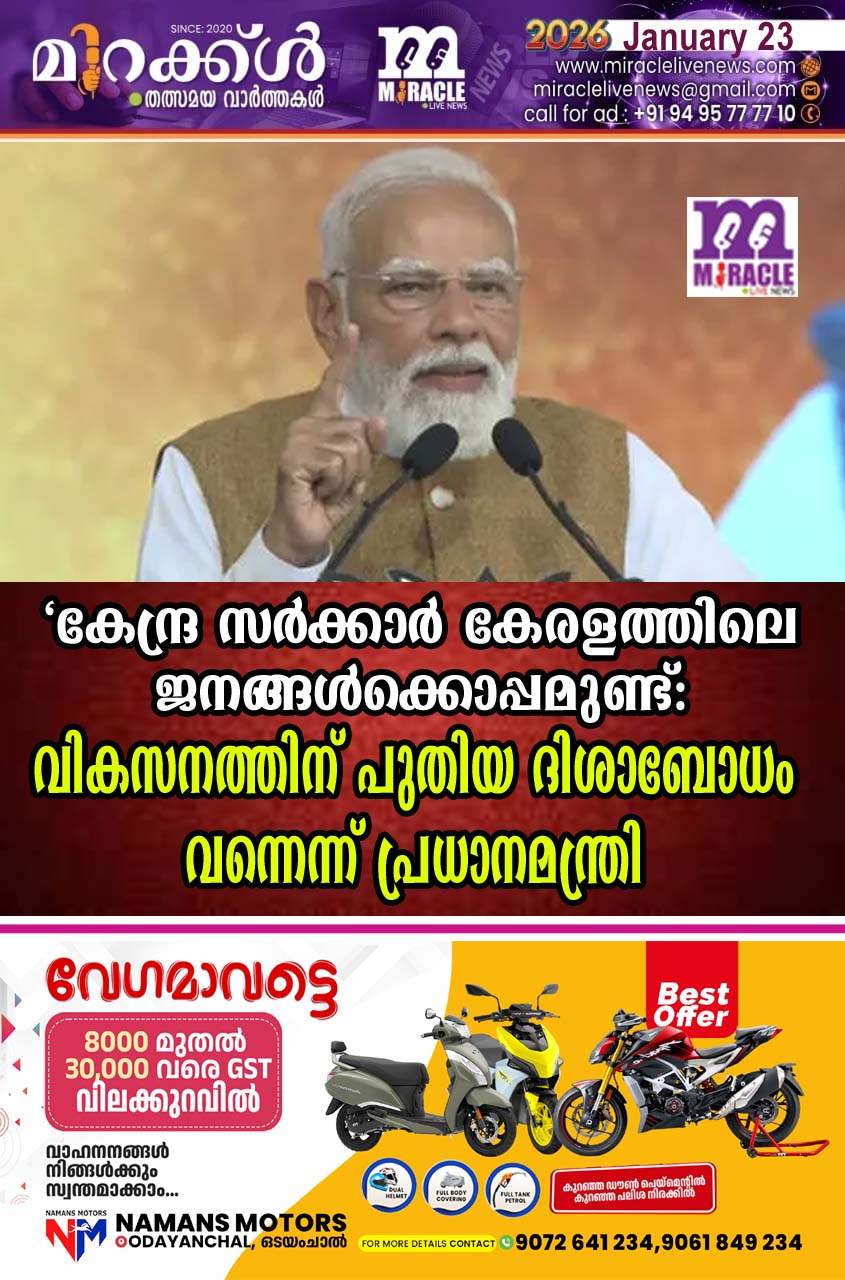 വികസിത കേരളത്തില് കൂടി മാത്രമേ വികസിത ഭാരതം പൂര്ത്തിയാക്കാനാകൂ. കേരളത്തിലെ ജനങ്ങള്ക്കൊപ്പം കേന്ദ്ര സര്ക്കാര് ഉണ്ടാകും. രാജ്യത്തെ മുഴുവന് പാവപ്പെട്ടവരുടെയും ഉന്നമനത്തിന് നടപ്പാക്കുന്ന ഒരു മഹത്തായ സംരഭത്തിനും തിരുവനന്തപുരത്ത് തുടക്കമായിട്ടുണ്ട്. കേരളത്തിന്റെ മാറ്റം തിരുവനന്തപുരത്ത് നിന്ന് തുടങ്ങും.