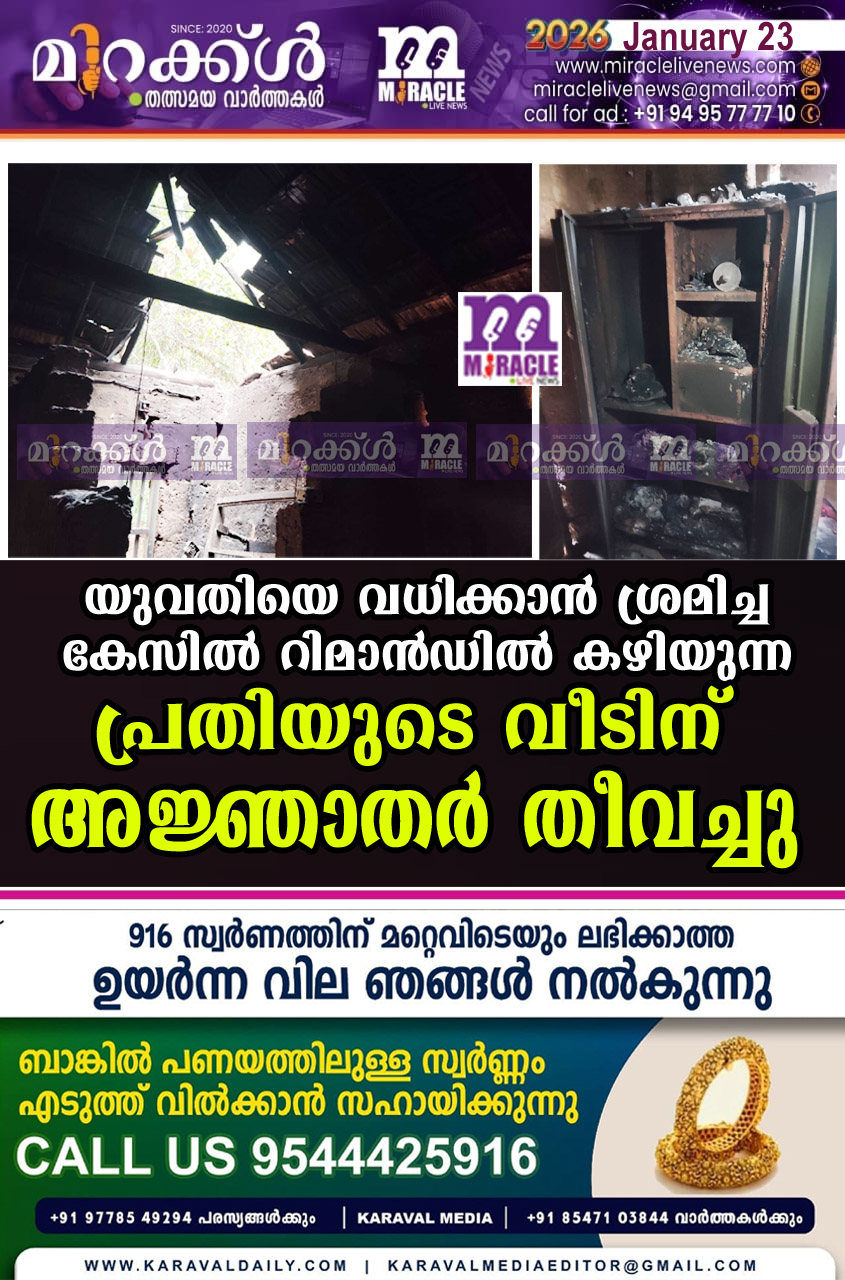 പരപ്പ: യുവതിയെ വധിക്കാന് ശ്രമിച്ച കേസിലെ പ്രതിയുടെ വീടിന് അജ്ഞാതര് തീവച്ചു. ഇന്നലെ രാത്രിയിലാണ് സംഭവം. എടത്തോട് മാധവന്റെ വീടിനാണ് തീ വെച്ചത്. അടച്ചിട്ട വാതില് കുത്തിത്തുറന്ന് അകത്ത് കടന്നതിനു ശേഷം വിലപ്പെട്ട രേഖകള് അടക്കം കത്തിച്ചു. കഴിഞ്ഞ ദിവസം എടത്തോട്ടെ ദാമോദരന്റെ ഭാര്യ സജിതയെ വധിക്കാന് ശ്രമിച്ച കേസില് മാധവന് കാഞ്ഞങ്ങാട് സബ് ജയിലില് റിമാന്ഡില് കഴിയുകയാണ്.