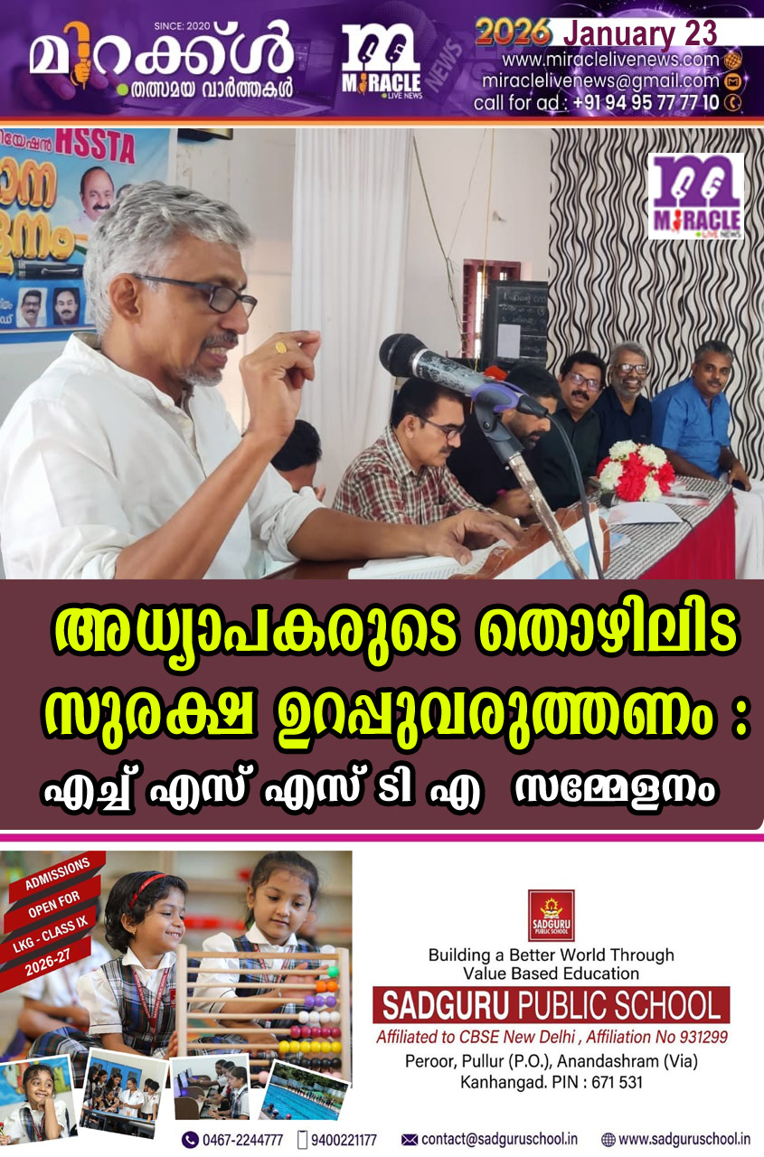 കാഞ്ഞങ്ങാട് : അധ്യാപകരും വിദ്യാര്ത്ഥികളും ആക്രമിക്കപ്പെടുന്ന തരത്തില് വിദ്യാലയങ്ങളില് ഏറി വരുന്ന സംഘര്ഷം നിറഞ്ഞ സാഹചര്യങ്ങള് നിയന്ത്രിക്കാന് വകുപ്പു തലത്തില് ശക്തമായ നടപടികള് വേണമെന്ന് ഹയര് സെക്കണ്ടറി സ്കൂള് ടീച്ചേഴ്സ് അസോസിയേഷന് സംസ്ഥാന സമ്മേളനം ആവശ്യപ്പെട്ടു. മൂല്യാധിഷ്ഠിത വിദ്യാഭ്യാസം നേരിടുന്ന വെല്ലുവിളികള് എന്ന വിഷയത്തില് വിദ്യാഭ്യാസ സെമിനാര് നടന്നു. ഡോ എസ് എന് മഹേഷ് ബാബു വിഷയാവതരണം നടത്തി. അഡ്വ ടി ബേബി മോഡറേറ്ററായി.