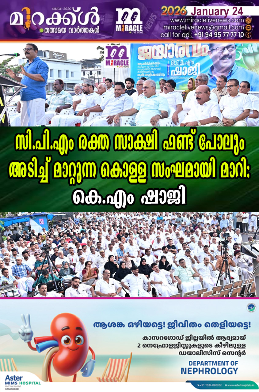 കാഞ്ഞങ്ങാട്: സി.പി.എം രക്തസാക്ഷി ഫണ്ട് പോലും അടിച്ച് മാറ്റുന്ന കൊള്ള സംഘമായി മാറിയതായി മുസ്ലിംലീഗ് സംസ്ഥാന സെക്രട്ടറി കെ.എം ഷാജി. കാഞ്ഞങ്ങാട് മണ്ഡലം മുസ്ലിംലീഗ് കമ്മിറ്റി തദ്ദേശ സ്വയം ഭരണ തിര ഞ്ഞെടുപ്പില്‍ വിജയിച്ചവര്‍ക്ക് നല്‍കുന്ന ആദര സ്വീകരണ പരിപാടിയായ ജയാരവം ഉദ്ഘാടനം ചെയ്യുകയായിരുന്നു അദ്ദേഹം.തൊട്ടടുത്ത പയ്യന്നൂരിലെ സി.പി.എം ജില്ലാ കമ്മിറ്റി അംഗമാണ് ഇത്തരത്തില്‍ വീണ്ടും ആരോപണവുമായി വന്നിട്ടുള്ളതെന്ന് ഷാജി കൂട്ടിചേര്‍ത്തു. സി.പി.എമിന്റെ നേതൃത്വത്തില്‍ നടക്കുന്ന കൊള്ളയ് ക്കെതിരെ എവിടെ പരാതിപ്പെടാനാണ്. അതിനെക്കാളും വലിയ കള്ളന്മാ രോടാണോ പരാതി പറയേണ്ടതെന്നും ഷാജി ചോദിച്ചു.26 രാജ്യങ്ങളില്‍ മുഖ്യമന്ത്രി സന്ദര്‍ശിച്ച് കഴിഞ്ഞിട്ട് എ ന്തെങ്കിലും നേട്ടം കേരളത്തിലെക്ക് കൊണ്ട് വന്നിട്ടു ണ്ടോ. കേരളത്തിലെ മുഴുവന്‍ പ്രോജക്ടുകളും ഊരാളുങ്കല്‍ സൊ സൈറ്റിക്കാണ് കൊടുക്കുന്നത്. ഇതിലാണ് സി.പി.എം നേതാക്കളുടെ നി ക്ഷേപമെന്നും ഷാജി കുറ്റപ്പെടുത്തി. വയനാട്ടില്‍ 400 വീടുകള്‍ പണിയാന്‍ 800 കോടി രൂപ യെന്തിനാണ് ഊരാളുങ്കല്‍ സൊ സൈറ്റിക്ക് കൊടുത്തതെന്നും ഷാജി ചോദിച്ചു.