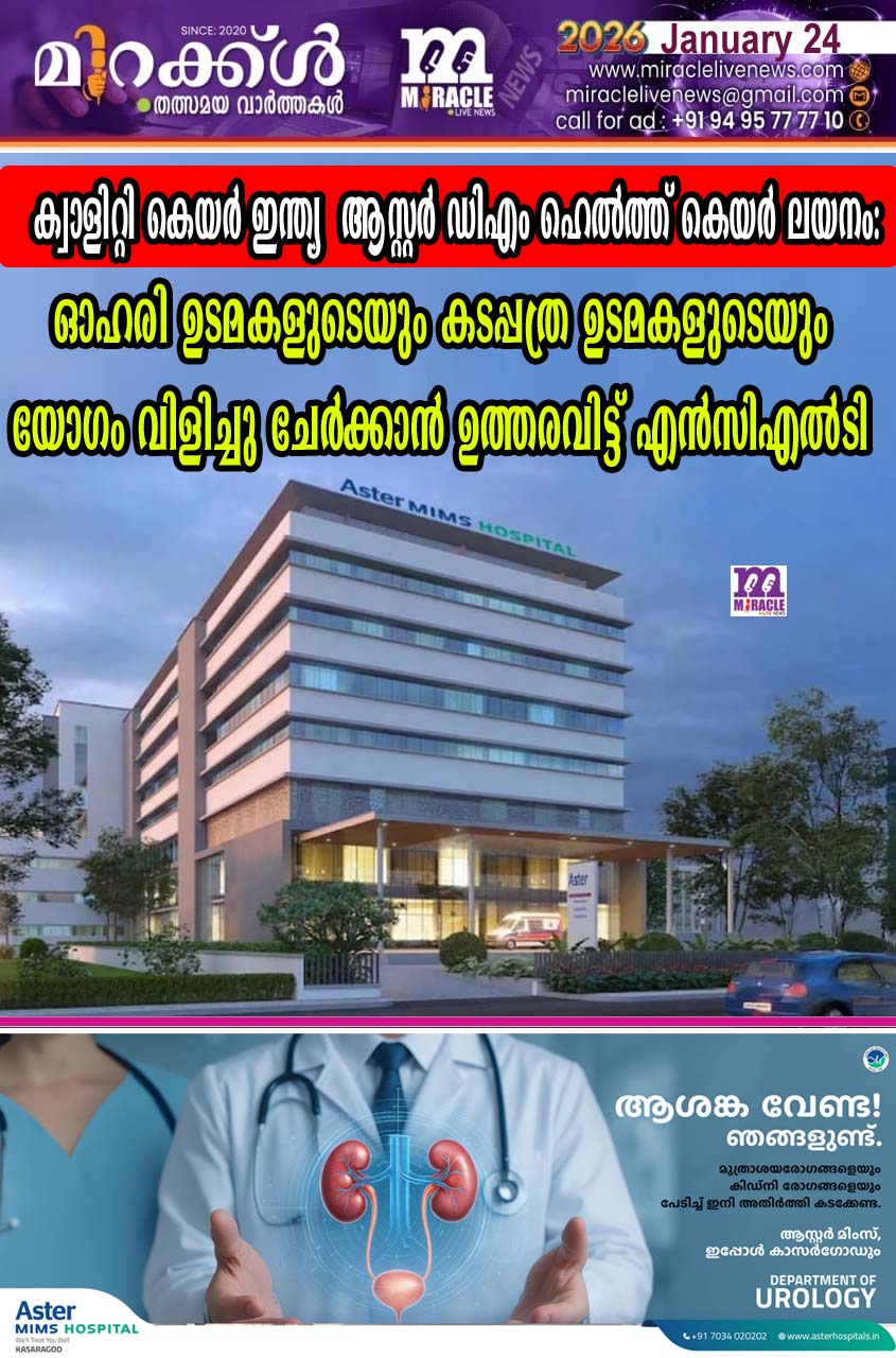 ബംഗളൂരു, ജനുവരി 23, 2026: ആസ്റ്റര് ഡിഎം ഹെല്ത്ത്കെയര് ലിമിറ്റഡും ക്വാളിറ്റി കെയര് ഇന്ത്യ ലിമിറ്റഡും തമ്മിലുള്ള ലയന നടപടികളില് സുപ്രധാന മുന്നേറ്റം. ലയനത്തിന് അംഗീകാരം തേടുന്നതിനായി ഓഹരി ഉടമകളുടെയും അണ്സെക്യൂര്ഡ് ട്രേഡ് ക്രെഡിറ്റേഴ്സിന്റെയും യോഗം വിളിച്ചുചേര്ക്കാന് നാഷണല് കമ്പനി ലോ ട്രിബ്യൂണലിന്റെ (NCLT) ഹൈദരാബാദ് ബെഞ്ച് ഉത്തരവിട്ടു. ഫെബ്രുവരി 27നും മാര്ച്ച് 13നും ഇടയിലായിരിക്കും യോഗം നടക്കുക. ഇന്ത്യയിലെ ആരോഗ്യമേഖലയിലെ ഏറ്റവും വലിയ ലയനങ്ങളിലൊന്നിന് മുന്നോടിയായാണ് ഈ സുപ്രധാന നീക്കം.
