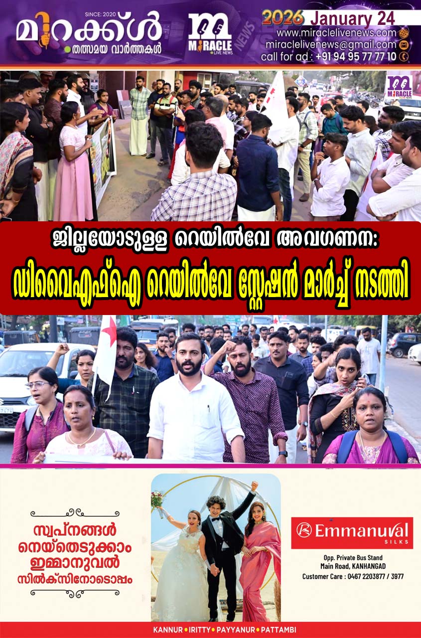 കാഞ്ഞങ്ങാട്:ഇന്ത്യന് റെയില്വേ കാസര്കോടിനോട് കാണിക്കുന്ന അവഗണന അവസാനിപ്പിക്കുക,അമൃത് ഭാരത് എക്സ്പ്രസ്ന് ജില്ലയില് കൂടുതല് സ്റ്റോപ്പ് അനുവദിക്കുക ,കാസര്കോട് എം പി റെയില്വേ വികസനത്തിന് ആവശ്യമായ ഇടപെടല് നടത്തുക തുടങ്ങിയ ആവശ്യങ്ങള് ഉന്നയിച്ച് ഡിവൈഎഫ്ഐ ജില്ലാ കമ്മിറ്റി കാഞ്ഞങ്ങാട് റെയില്വേ സ്റ്റേഷനിലേക്ക് മാര്ച്ച് നടത്തി. നിരവധി ആളുകള് പങ്കെടുത്ത് കുന്നുമ്മലില് നിന്നും പ്രകടനം ആരംഭിച്ചു. തുടര്ന്ന് കാഞ്ഞങ്ങാട് റെയില്വേ സ്റ്റേഷനുമുന്നില് പ്രകടനം പോലീസ് തടഞ്ഞു.തുടര്ന്ന് നടത്തിയ പൊതുയോഗം ജില്ലാ സെക്രട്ടറി രജീഷ് വെള്ളാട്ട് ഉദ്ഘാടനം ചെയ്തു. ബ്ലോക്ക് പ്രസിഡന്റ് യതീഷ് വാരിക്കാട്ട് അധ്യക്ഷത വഹിച്ചു. വി ഗിനീഷ്, ഹരിത നാലപ്പാടം, വി പി അമ്പിളി, അനീഷ് കുറുമ്പാലം എന്നിവര് സംസാരിച്ചു.ബ്ലോക്ക് സെക്രട്ടറി സുജിത്ത് മോനാച്ച സ്വാഗതം പറഞ്ഞു.