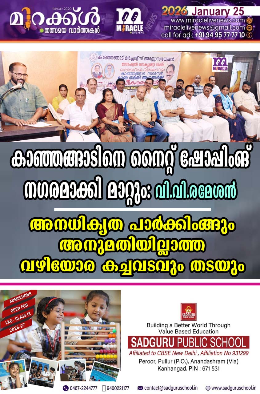 കാഞ്ഞങ്ങാട്:നഗരത്തെ വെളിച്ചത്തിന്റെ നഗരമാക്കുന്നതിനൊപ്പം രാത്രി 12 മണി വരെ കച്ചവട സ്ഥാപനങ്ങള് തുറന്നു വെച്ച് മറ്റു വന് നഗരങ്ങളെ പോലെ നെറ്റ് ഷോപ്പിംങ് സംവിധാനം ഏര്പ്പെടുത്തുമെന്ന് (രാത്രികാല കച്ചവടം ) നഗരസഭ ചെയര്മാന് വി.വി.രമേശന്.