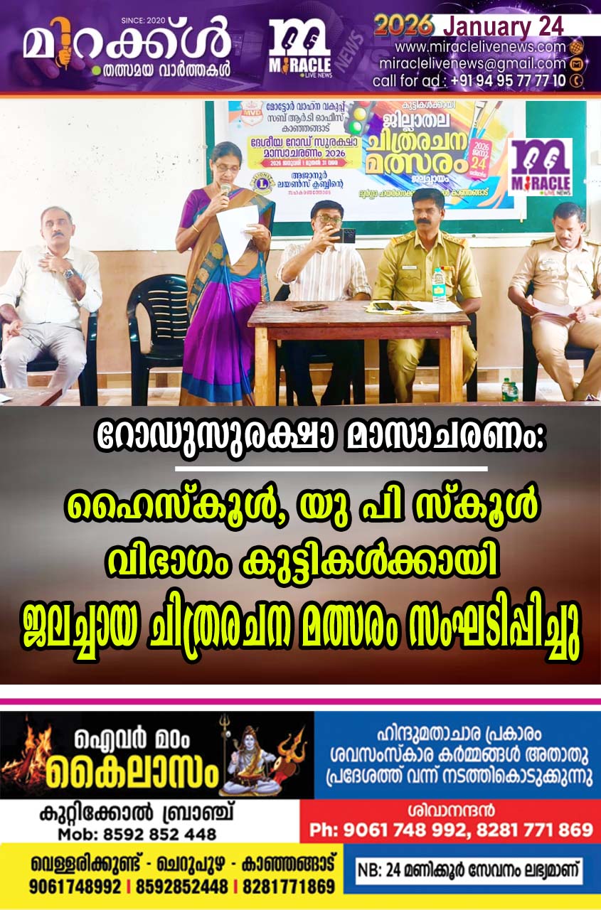 കാഞ്ഞങ്ങാട്: റോഡുസുരക്ഷാ മാസാചരണത്തിന്റെ ഭാഗമായി അജാനൂര് ലയണ്സ് ക്ലബിന്റെ സഹകരണത്തോടെ ഹൈസ്കൂള്, യു പി സ്കൂള് വിഭാഗം കുട്ടികള്ക്കായി ജലച്ചായ ചിത്രരചന മത്സരം സംഘടിപ്പിച്ചു. കാഞ്ഞങ്ങാട് ബ്ലോക്ക് പഞ്ചായത്ത് പ്രസിഡന്റ് സുജാത ഉദ്ഘാടനം ചെയ്തു. ലയണ്സ് ക്ലബ് പ്രസിഡന്റ് സിഎംകെ അബ്ദുള്ള അധ്യക്ഷനായി. ദുര്ഗ ഹയര് സെക്കന്ററി സ്കൂള് പ്രിന്സിപ്പാള് ഡോ. എന് വേണുനാഥന്, സബീന നലവടത്ത്, എം വിജയന്, കെ.വി.ജയന്, സുനില്രാജ്, കെ. അഭിലാഷ്, സുമോദ് മോഹന് എന്നിവര് സംസാരിച്ചു.