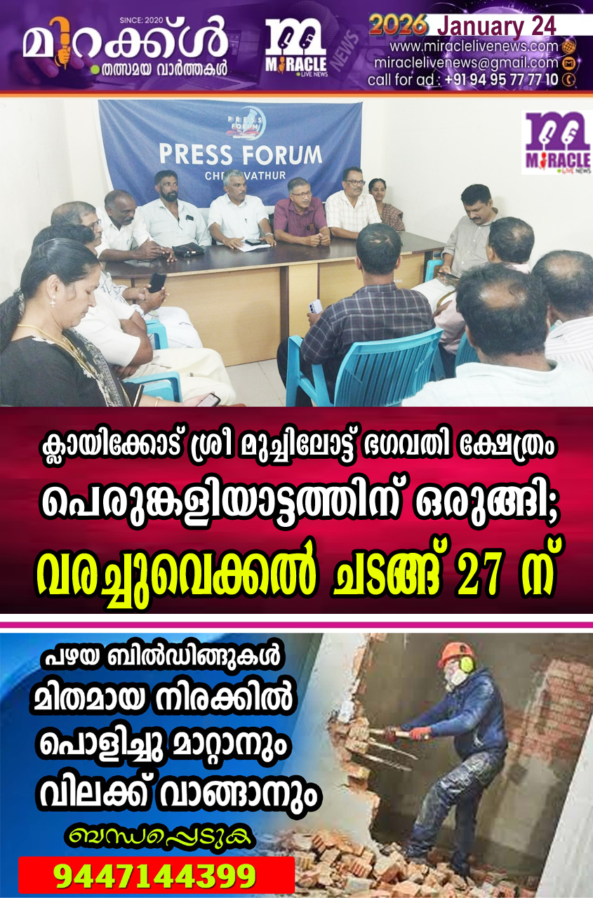 ചെറുവത്തൂര്: പതിനെട്ടു സംവത്സരങ്ങള്ക്ക് ശേഷം ക്ലായിക്കോട് ശ്രീ മുച്ചിലോട്ട് ഭഗവതി ക്ഷേത്രത്തില് ഫെബ്രുവരി 4 മുതല് 7 വരെ പെരുങ്കളിയാട്ടം നടക്കും. 27 ന് പെരുങ്കളിയാട്ടത്തിന്റെ പ്രധാന ചടങ്ങുകളിലൊന്നായ വരച്ചു വയ്ക്കല് ചടങ്ങ് നടക്കും. രാവിലെ 9 മണിക്കും 9.45 മണിക്കും ഇടയിലുള്ള ശുഭമുഹൂര്ത്തത്തില് ആണ് വരച്ചുവെക്കല് ചടങ്ങ്. അന്നേദിവസം വിവിധ മുച്ചിലോട്ടുകളില് നിന്നുള്ള ആചാര സ്ഥാനികര് ഉള്പ്പെടെ പതിനായിരത്തോളംപേര് ക്ഷേത്രത്തിലേക്ക് എത്തിച്ചേരും. വരച്ചു വയ്ക്കല് ദിനം മുതല് പെരുങ്കളിയാട്ട സമാപന ദിവസത്തിന്റെ തലേന്ന് വരെ വിവിധ കലാ–സാംസ്കാരിക പരിപാടികള് സംഘടിപ്പിക്കും.