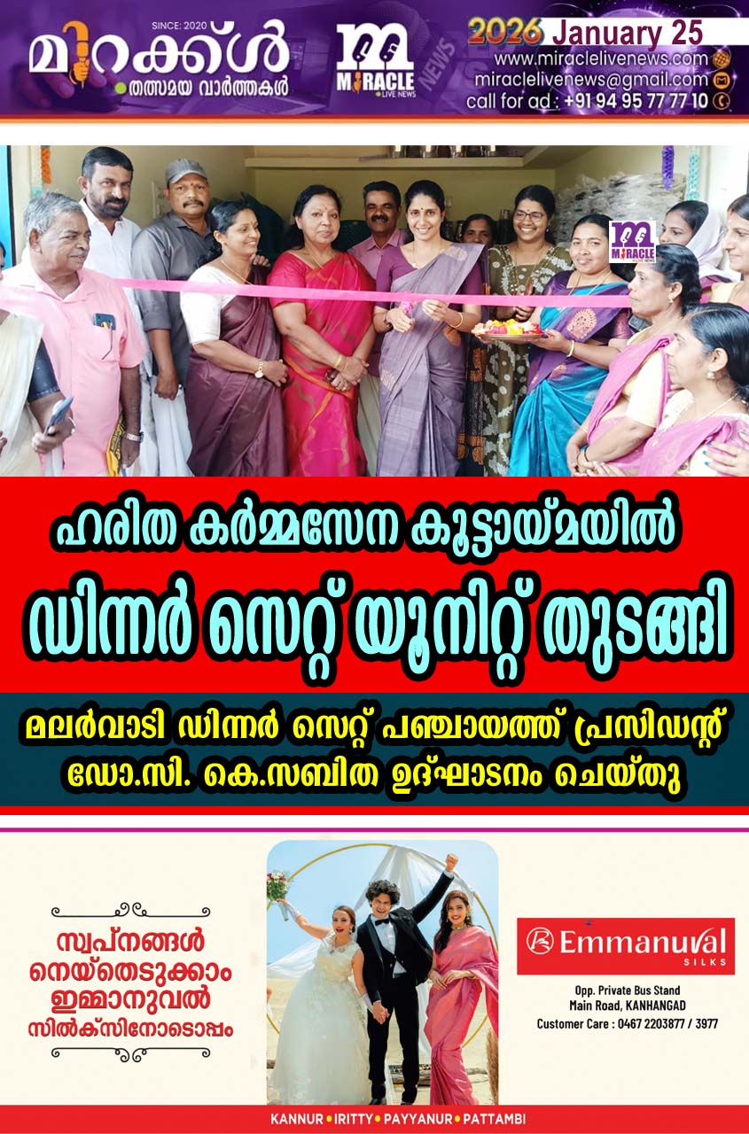 ഹരിത കര്‍മ്മസേന കൂട്ടായ്മയില്‍ ഡിന്നര്‍ സെറ്റ് യൂനിറ്റ് തുടങ്ങി; മലര്‍വാടി ഡിന്നര്‍ സെറ്റ് പഞ്ചായത്ത് പ്രസിഡന്റ് ഡോ.സി. കെ.സബിത ഉദ്ഘാടനം ചെയ്തു