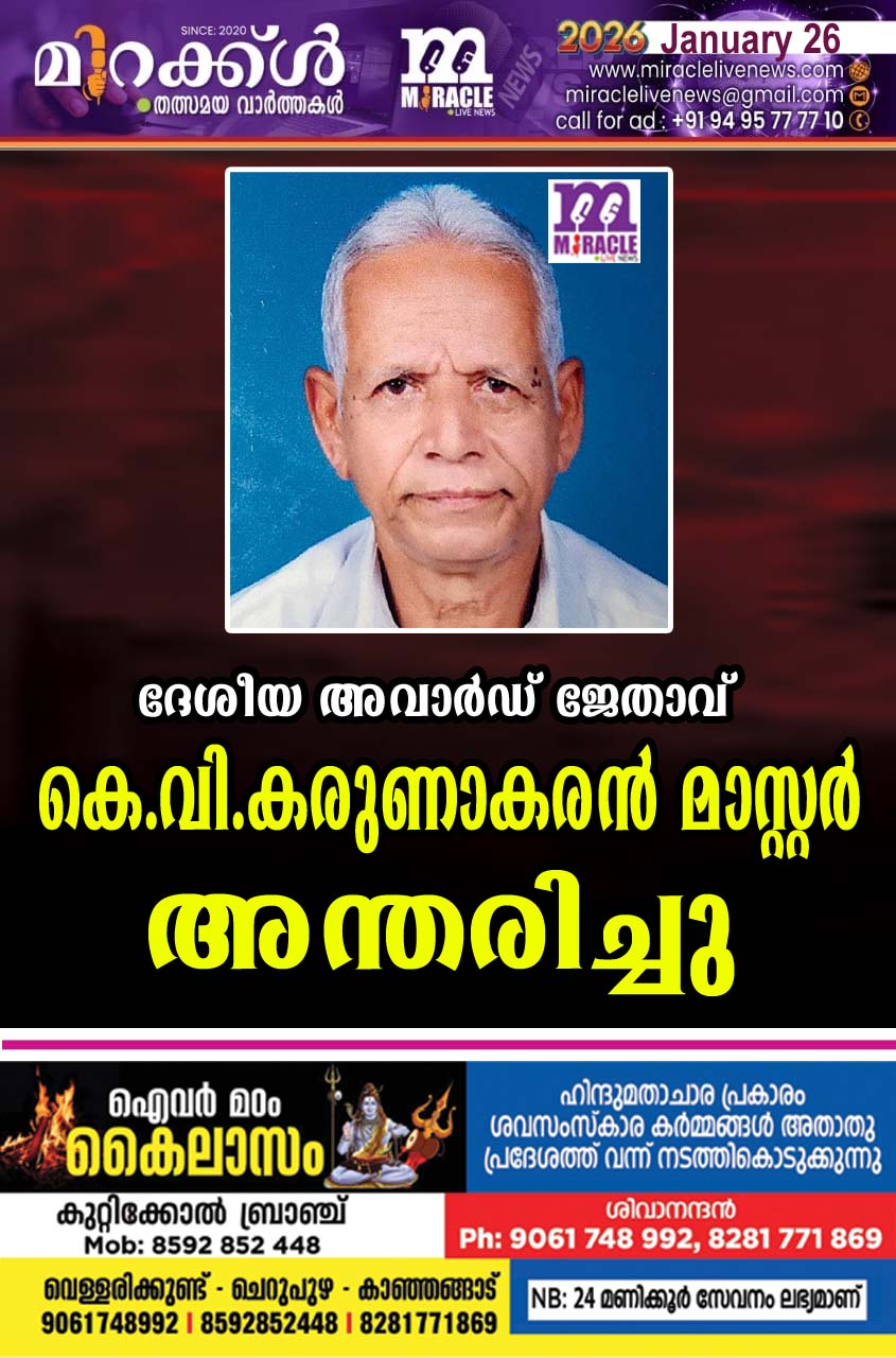 പാലക്കുന്ന് : മുന് അധ്യാപകനും ദേശീയ അവാര്ഡ് ജേതാവുമായ ഉദുമ കണ്ടത്ത് വളപ്പില് കെ. വി. കരുണാകരന് (92) അന്തരിച്ചു. അദ്ദേഹം പ്രഥമാധ്യാപകനായിരുന്ന കോട്ടിക്കളം ഗവ. യു.പി സ്കൂളിലായിരുന്നു സംസ്ഥാനത്ത് ആദ്യമായി അപ്പര് പ്രൈമറി വിഭാഗത്തില് ബാലകലോത്സവത്തിന് തുടക്കമിട്ടത്. പാലക്കുന്ന് കഴകം ഭഗവതി ക്ഷേത്രം പ്രഥമ ഭരണസമിതിയിലെ അംഗമായിരുന്ന അദ്ദേഹം ക്ഷേത്ര വിദ്യാഭ്യാസ സമിതിയുടെ ആദ്യ കമ്മിറ്റിയില് വൈസ് പ്രസിഡന്റായും തുടര്ന്ന് പ്രസിഡന്റായും പ്രവര്ത്തിച്ചു.ഏറെ വര്ഷക്കാലം ക്ഷേത്ര അംബിക പരിപാലന സംഘത്തിന്റെ പ്രസിഡന്റ്, ക്ഷേത്ര ഭരണ സമിതിയുടെ തിരഞ്ഞെടുപ്പ് മുഖ്യ വരണാധികാരി സ്ഥാനങ്ങളും കേരള സ്റ്റേറ്റ് സര്വീസ് പെന്ഷനെഴ്സ് ഉദുമ യൂണിറ്റ് പ്രസിഡന്റും ആയിരുന്നു. പരേതരായ അപ്പയുടെയും, കുഞ്ഞിതേയിയുടെയും മകന്. ഭാര്യ കെ. ഭാനുമതി 40 ദിവസം മുന്പാണ് മരിച്ചത്. മക്കള്: ഡോ. കെ. വി. ജയപ്രകാശ് (കോഴിക്കോട്), കെ. വി. ജയചന്ദ്രന് (ഷാങായി, ചൈന), കെ. വി. ജയശ്രീ (മുംബൈ), അഡ്വ. കെ. വി. ജയരാജ് (നോട്ടറി കാഞ്ഞങ്ങാട്). മരുമക്കള്: പി. ആര്. അനുരാധ (പ്രൊഫസര്, മലബാര് ക്രിസ്ത്യന് കോളജ്, കോഴിക്കോട്), ഹിത (ഷറഫ കോളജ്, പടന്ന), മുരളിധരന് (ബിസിനസ് മുംബൈ), ഡോ. വി. കെ.സനില (പ്രൊഫസര് കണ്ണൂര് ആയുര്വേദ മെഡിക്കല് കോളജ് പരിയാരം). സഹോദരങ്ങള്: കെ. വി. കുമാരന്(മുന് അധ്യാപകന്, വിവര്ത്തകന്, കേന്ദ്ര സാഹിത്യ അക്കാദമി പുരസ്കാര ജേതാവ് ), കെ. വി. രാഘവന് (പി പി ഐ റാലിസ് ഇന്ത്യ മുന് ഉദ്യോഗസ്ഥന്, ഊട്ടി), പരേതരായ കണ്ണന്കുട്ടി (മുന് ഡെപ്യുട്ടി കലക്ടര്, ചെന്നൈ), ചിരുത, കറുവന്, കുഞ്ഞമ്മ. പാലക്കുന്നിലും ഉദുമയിലും അദ്ദേഹത്തിന്റെ ശിഷ്യഗണത്തില് പെട്ട പലരും ഇപ്പോള് സമൂഹത്തിന്റെ ഉന്നത തലത്തിലാണ്. അവരില് സ്ഥലത്തുള്ള പലരും മാഷെ ഒരു നോക്കു കാണാന് എത്തിയിരുന്നു. വീട്ടിലെ അന്ത്യ കര്മങ്ങള്ക്കു ശേഷം ഭൗതിക ശരീരം കാപ്പില് സമുദായ ശ്മശാനത്തില് സംസ്കരിച്ചു. മാഷിന്റെ ആഗ്രഹമനുസരിച്ച് തുടര്ന്നുള്ള മരണാനന്തര ചടങ്ങുകള് ഒഴിവാക്കിയിട്ടുണ്ട്.