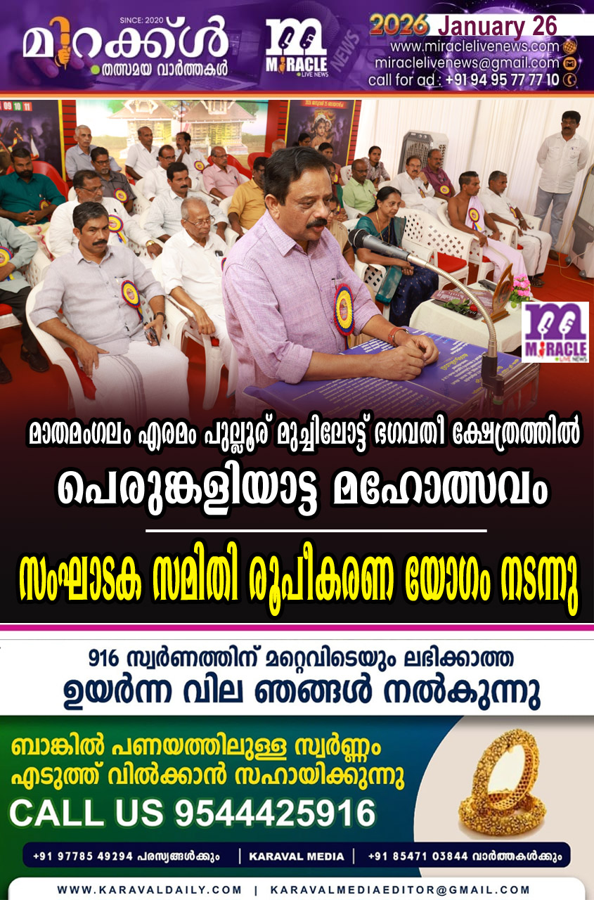 പയ്യന്നൂര്/മാതമംഗലം:: എരമം പുല്ലൂര് മുച്ചിലോട്ട് ഭഗവതീ ക്ഷേത്രത്തില് പതിനേഴ് സംവല്സരങ്ങള്ക്ക് ശേഷം 2027 ജനുവരി 8 മുതല് 11 വരെ നടക്കുന്ന പെരുങ്കളിയാട്ട മഹോത്സവത്തിന്റെ വിജയത്തിനായി സംഘാടക സമിതി രൂപീകരണ യോഗം ക്ഷേത്ര സന്നിധിയില് വെച്ച് നടന്നു. ടി. ഐ. മധുസൂദനന് എം.എല്.എ. ഉദ്ഘാടനം ചെയ്തു.