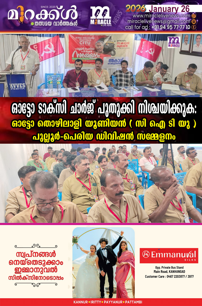 പെരിയ : ഇന്ധനത്തിന്റെയും സ്പെയര് പാര്ട്സുകളുടെയും നിത്യോപയോഗ സാധനങ്ങളുടെയും വില കുതിച്ചുയര്ന്ന സാഹചര്യത്തില് മോട്ടോര് മേഖലയില് പണിയെടുക്കുന്ന തൊഴിലാളികള് വലിയ പ്രയാസത്തിലാണ്. വിലവര്ദ്ധനവിന് ആനുപാതികമായി ഓട്ടോ ടാക്സി ചാര്ജ് പുതുക്കി നിശ്ചയിക്കണമെന്ന് ഓട്ടോ തൊഴിലാളി യൂണിയന് ( സി ഐ ടി യു ) പുല്ലൂര്- പെരിയ ഡിവിഷന് സമ്മേളനം പ്രമേയത്തിലൂടെ അധികാരികളോട് ആവശ്യപ്പെട്ടു. പെരിയ ബസാറിലെ സഖാവ് ടി വി കരിയന് നഗറില് ( വ്യാപാരി ഭവന് ഹാള് ) നടന്ന സമ്മേളനം ഡിവിഷന് പ്രസിഡന്റ് രാജന് അമ്പലത്തറയുടെ അദ്ധ്യക്ഷതയില് സി ഐ ടി യു ജില്ലാ വൈസ് പ്രസിഡന്റ് കാറ്റാടി കുമാരന് ഉദ്ഘാടനം ചെയ്തു. ഡിവിഷന് സെക്രട്ടറി സുനില്കുമാര് വേലാശ്വരം സ്വാഗതം പറഞ്ഞ് പ്രവര്ത്തന റിപ്പോര്ട്ട് അവതരിപ്പിച്ചു. ഡിവിഷന് ട്രഷറര് പ്രകാശന് പുല്ലൂര് വരവ് ചെലവ് കണക്ക് അവതരിപ്പിച്ചു. ഓട്ടോ തൊഴിലാളി യൂണിയന് (സി ഐ ടി യു) ജില്ലാ കമ്മിറ്റി അംഗം യു കെ പവിത്രന് സംഘടന റിപ്പോര്ട്ട് അവതരിപ്പിച്ചു. യു പ്രകാശന് രക്തസാക്ഷി പ്രമേയവും സതീശന് തണ്ണോട്ട് അനുശോചനപ്രമേയവും അവതരിപ്പിച്ചു. ചടങ്ങില് വെച്ച് പെരിയ ബസ് സ്റ്റോപ്പ് യൂണിറ്റ് മെമ്പര് രതീഷ് തന്നിത്തോടിന്റെ മകള് ശ്രിയ ക്യാന്സര് രോഗികള്ക്ക് കേശദാനം നടത്തി. കാറ്റാടി കുമാരന് ഏറ്റുവാങ്ങി. ശ്രീനിവാസന് വടക്കേക്കര നന്ദി പറഞ്ഞു. സമ്മേളനത്തിന് മുന്നോടിയായി പെരിയ ബസാറില് പതാക ഉയര്ത്തി. പുതിയ ഭാരവാഹികളായി രാജന് അമ്പലത്തറ (പ്രസിഡന്റ് ), ബാലചന്ദ്രന് പെരിയ, രമേശന് പെരിയ ബസാര് (വൈസ് പ്രസിഡന്റുമാര് ) , സുനില്കുമാര് വേലാശ്വരം ( സെക്രട്ടറി ), അനില്കുമാര് അമ്പലത്തറ, സതീശന് ഏലോത്തടുക്കം ( ജോയിന്റ് സെക്രട്ടറിമാര് ) പ്രകാശന് പുല്ലൂര് (ട്രഷറര് ) എന്നിവരെ തെരഞ്ഞെടുത്തു