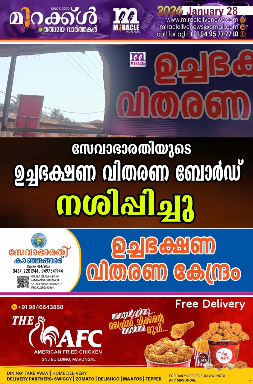 കാഞ്ഞങ്ങാട്: തോയമ്മല്‍ ജില്ല ആശുപത്രിയില്‍ പരിസരത്ത് സേവാഭാരതിയുടെ സൗജന്യ ഉച്ച ഭക്ഷണ വിതരണം ബോര്‍ഡ് സാമൂഹ്യ ദ്രോഹികള്‍ കീറി നശിപ്പിച്ചു. നേരെയും ഇവിടെ സ്ഥാപിച്ചിരുന്ന ബോര്‍ഡ് എടുത്ത് പോയി നിശിപ്പിച്ചിരുന്നു. സൗജന്യ ഭക്ഷണ വിതരണത്തിന്റെ 22 o വര്‍ഷികമായി .ഈ മാസം 26 ന് .ഇതിന്റെ ഭാഗമായിട്ടാണ്