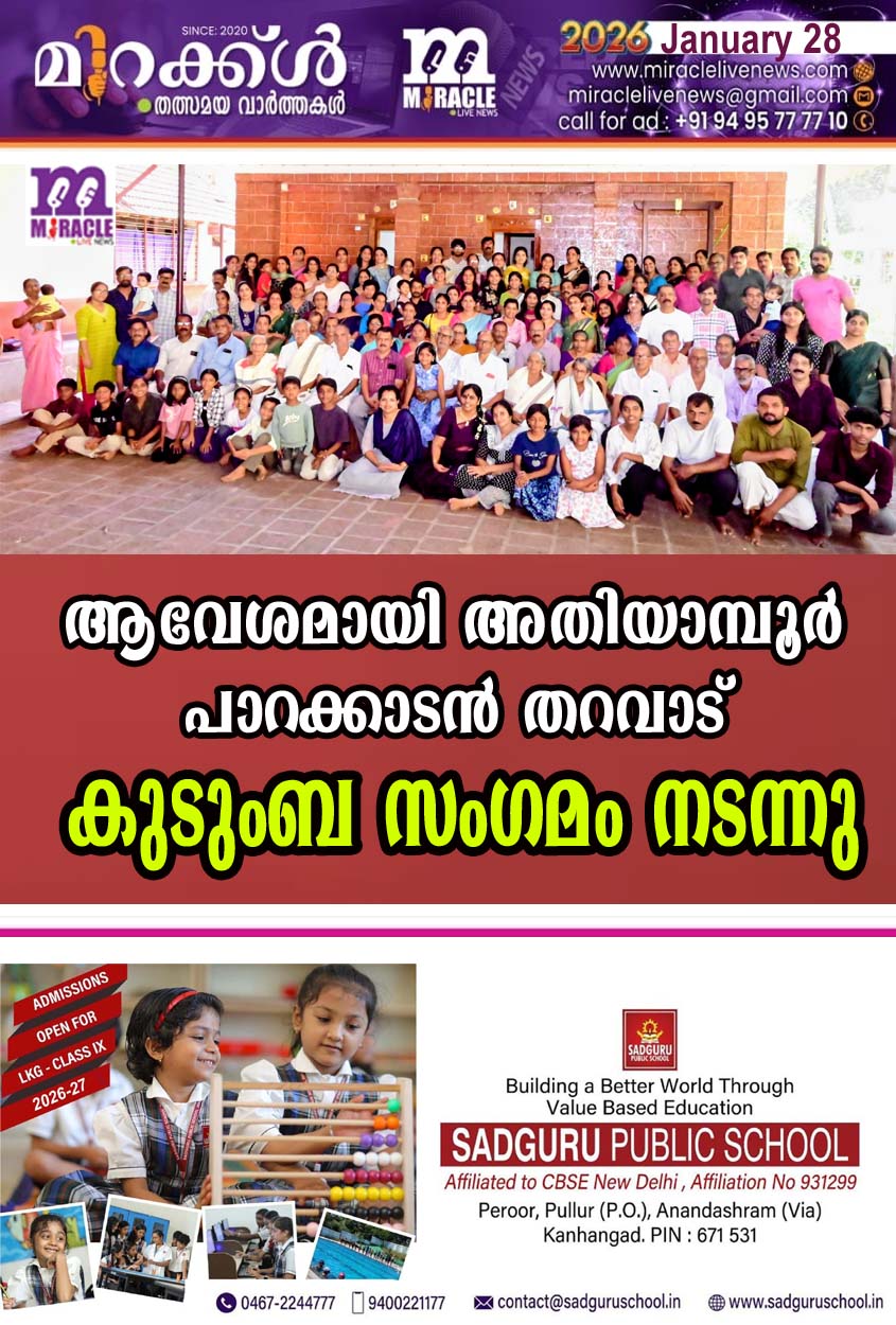 കാഞ്ഞങ്ങാട്:കുടുംബ സംഗമത്തിന് പുതിയ ആവേശവും ആശയവും നല്കി അതിയാമ്പൂര് പാറക്കാടന് തറവാട് കുടുംബ സംഗമം നടന്നു. നാട്ടിലെയും മറുനാട്ടിലെയും നിരവധി കുടുംബാംഗങ്ങളുടെ പങ്കാളിത്തത്തിലാണ് സംഗമം നടന്നത്. സാംസ്കാരിക പ്രവര്ത്തകന് പി അപ്പുക്കുട്ടന് സംഗമം ഉദ്ഘാടനം ചെയ്തു. തറവാട് പ്രസിഡന്റ് പി കുഞ്ഞമ്പു നായര് അധ്യക്ഷനായി. ട്രഷറര് ദിവാകരന് പാറക്കാട്, വൈസ് പ്രസിഡന്റ് പി ഭാസ്കരന് ,മേനപ്പുറം കുഞ്ഞമ്പു പൊതുവാള്, കെ ബാലകൃഷ്ണന് നായര്, ജോയിന്റ് സെക്രട്ടറി പി കപില് കുമാര്,മാതൃസമിതി പ്രസിഡന്റ് പി വനജാക്ഷി,സെക്രട്ടറി പി.കുശല എന്നിവര് സംസാരിച്ചു. തറവാട്ട് സെക്രട്ടറി പി കൃഷ്ണന് നായര് സ്വാഗതവും പി മോഹനന്നന്ദിയും പറഞ്ഞു. 80 വയസ്സിന് മുകളില് പ്രായമുള്ള തറവാട്ട് അംഗങ്ങളായ ബാലാമണി അമ്മ, സരോജിനിയമ്മ, പത്മാവതി,പി ഭാസ്കരന്,അമ്മാളു അമ്മ, പി കുഞ്ഞമ്പുപൊതുവാള്, പി നാരായണന് നായര്, പി ഓമനഎന്നിവരെ ആദരിച്ചു.വിവിധ കലാകായിക മത്സരങ്ങളും നടന്നു.