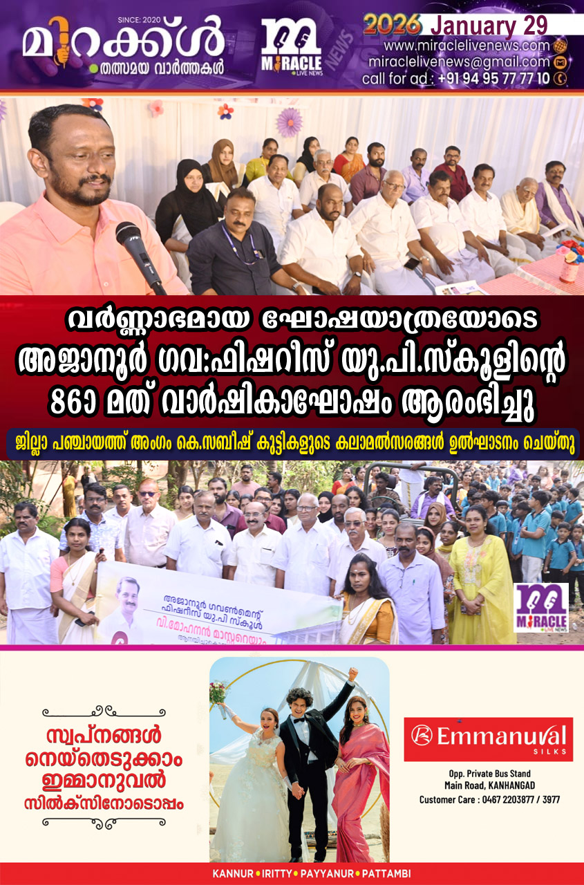 കാഞ്ഞങ്ങാട്:തീരദേശ ഗ്രാമത്തിന്റെ അക്ഷരജ്യോതിസ്സ് അജാനൂര് ഗവ:ഫിഷറീസ് യു.പി.സ്കൂള് 86 ആം വാര്ഷികാഘോഷവും 35 വര്ഷത്തെ വിജയകരമായ സര്വീസ് ജീവിതം പൂര്ത്തിയാക്കി മാര്ച്ച് 31ന് പടിയിറങ്ങുന്ന പ്രധാനാധ്യാപകന് വി.മോഹനന് മാസ്റ്റര്ക്ക് തീരദേശ ഗ്രാമം ഒരുക്കുന്ന യാത്രയയപ്പും രാവിലെ ഇട്ടമ്മല് ജംഗ്ഷനില് നിന്നുള്ള ഘോഷയാത്രയോടെ ആരംഭിച്ചു. ബാന്ഡ് മേളത്തിന്റെ അകമ്പടിയോടെ വി.മോഹനന് മാസ്റ്ററെ തുറന്ന ജീപ്പില് ആനയിച്ചു. ഫിനാന്സ് കമ്മിറ്റി ചെയര്മാന് എ.അബ്ദുള്ള,പി.ടി എ പ്രസിഡണ്ട് ജാഫര് പാലായി,പൂര്വ വിദ്യാര്ത്ഥി സംഘടനാ പ്രസിഡണ്ട് നൗഷാദ് കൊത്തിക്കാല്, സെക്രട്ടറി രാജേഷ് കാറ്റാടി, ട്രഷറര് എ ഹമീദ് ഹാജി, വികസന സമിതി ഭാരവാഹികളായ കെ.രാജന്, എ.പി.രാജന്, പി.കുഞ്ഞബ്ദുള്ള ഹാജി, പ്രോഗ്രാം ചെയര്മാന് കെ.ജി സജീവന്, സി.മുഹമ്മദ് കുഞ്ഞി. കെ.മണികണ്ഠന്, ബി.എസ് റംസീന, കെ.രജനീഷ്, കെ.എസ് പ്രശാന്ത്, നദീറ ബാനു ,ഹാജറ ടീച്ചര് എന്നിവര് ഘോഷയാത്രയ്ക്ക് നേതൃത്വം നല്കി.പി ടി എ, എസ് എം സി, എം പി ടി എ ഭാരവാഹികളും രക്ഷിതാക്കളും അധ്യാപികമാരും കുട്ടികള്ക്കൊപ്പം ഘോഷയാത്രയില് അണിനിരന്നു.