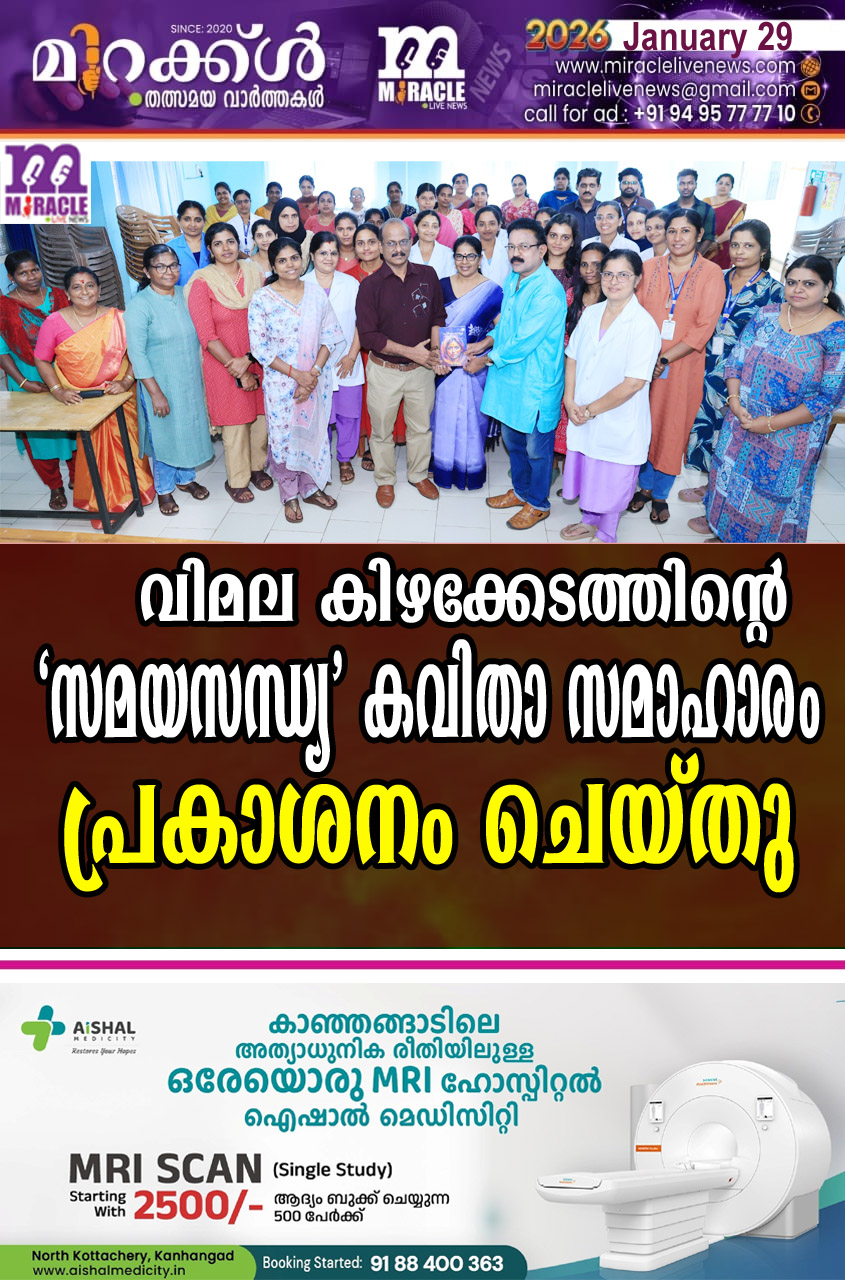 രാജപുരം : പത്മശ്രീ പുസ്തകശാല കാഞ്ഞങ്ങാട്പ്രസിദ്ധീകരിച്ച വിമല കിഴക്കേടത്തിന്റെ സമയ സന്ധ്യ എന്ന കവിത സമാഹാരത്തിന്റെ പ്രകാശന കര്‍മ്മം നടന്നു. പൂടംകല്ല് താലൂക്ക് ആശുപത്രി കോണ്‍ഫറന്‍സ് ഹാളില്‍ കവിയും ദൃശ്യമാധ്യമപ്രവര്‍ത്തകനുമായ നാലപ്പാടം പത്മനാഭന്‍ കവിത സമാഹാരത്തിന്റെ പ്രകാശന കര്‍മ്മം നിര്‍വഹിച്ചു. ഡോക്ടര്‍ സി. സുകു പുസ്തകം ഏറ്റുവാങ്ങി. ഡോക്ടര്‍ വി. കെ. ഷിന്‍സി അധ്യക്ഷയായി. അനി തോമസ്, എം. ലീല, മൃദുല അരവിന്ദ്, വിമല ഗംഗാധരന്‍, സ്വാതി മുരളി,ഷാജി എന്നിവര്‍ സംസാരിച്ചു. വിമല കിഴക്കേടം മറുമൊഴി ഭാഷണം നടത്തി. ബിജിമോള്‍ മാത്യു സ്വാഗതം പറഞ്ഞു.