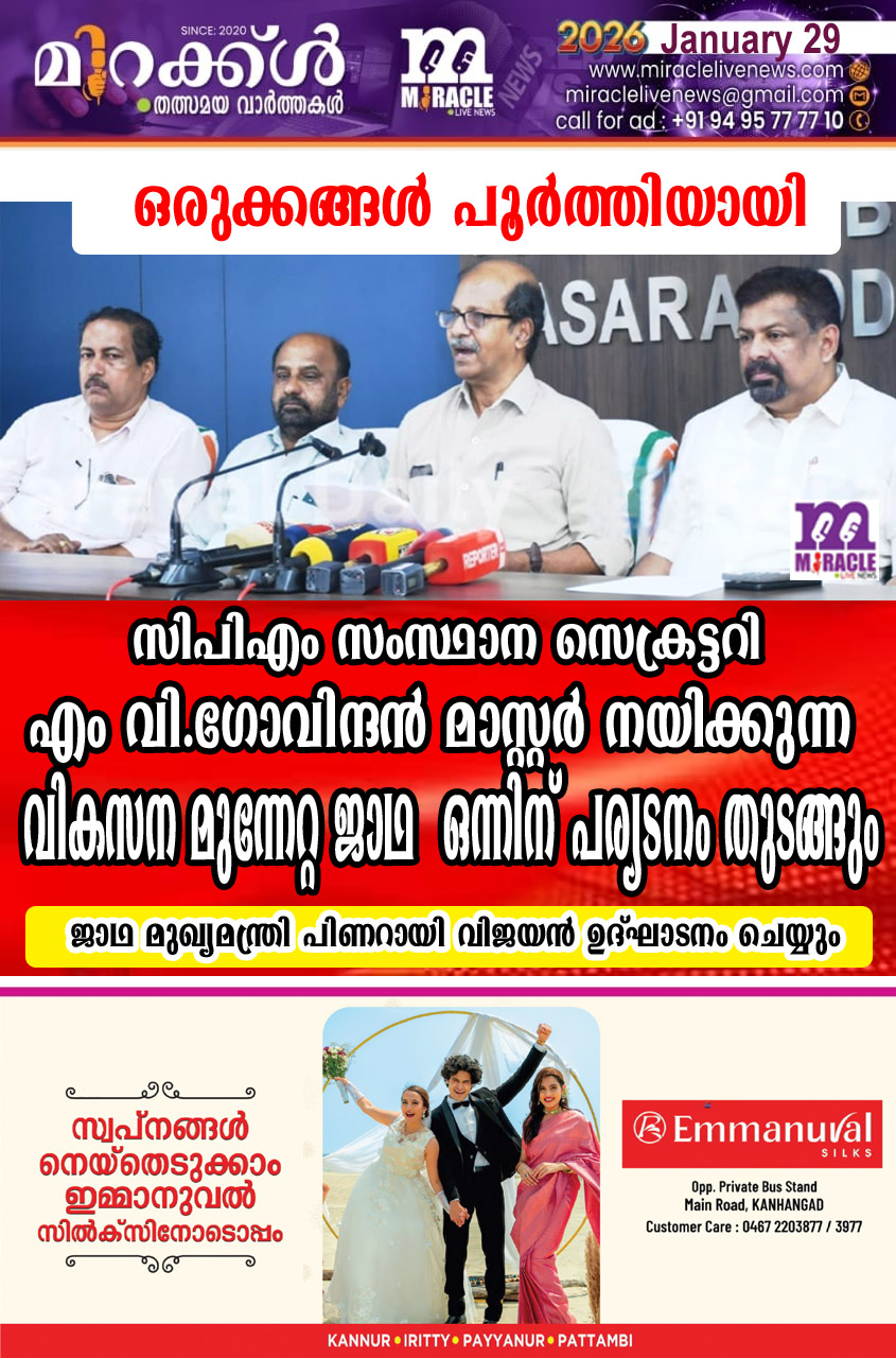 കാസര്കോട്: എല്ഡിഎഫ് സംസ്ഥാന കമ്മിറ്റിയുടെ നേതൃത്വത്തില് സിപിഎം സംസ്ഥാന സെക്രട്ടറി എം വി. ഗോവിന്ദന് മാസ്റ്റര്നയിക്കുന്ന വടക്കന് മേഖലാ വികസന മുന്നേറ്റ ജാഥ ഫെബ്രുവരി ഒന്നിന് വൈകീട്ട് 3ന് കുമ്പളയില് നിന്നും പര്യടനം തുടങ്ങും. ജാഥക്കുളള ഒരുക്കങ്ങള് പൂര്ത്തിയായതായി എല്ഡിഎഫ് ജില്ലാ കണ്വീനര് കെ.പി സതീഷ് ചന്ദ്രന് പറഞ്ഞു. ജാഥ മുഖ്യമന്ത്രി പിണറായി വിജയന് ഉദ്ഘാടനം ചെയ്യും. സിപിഐ ദേശീയ എക്സിക്യൂട്ടീവ് അംഗം പി. സന്തോഷ് കുമാര്, എംപിയാണ് ജാഥാ മാനേജര്. കെഎസ് സലീഖ, മാത്യുകുന്നപ്പള്ളി, പിപി ദിവാകരന്, പിഎം സുരേഷ്ബാബു, മനയത്ത് ചന്ദ്രന്, ബാബുഗോപിനാഥന്, വടകോട് മോനച്ചന്, എജെ ജോസഫ്, കാസിം ഇരിക്കൂര്, നൈസ് മാത്യു എന്നിവര് ജാഥാംഗങ്ങളാണ്. ജാഥയുടെ ആദ്യ ദിവസത്തെ സമാപനം നുള്ളിപ്പാടിയില് നടക്കും. ഫെബ്രുവരി രണ്ടിന് രാവിലെ 10ന് പെരിയാട്ടടുക്കത്തും മൂന്നു മണിക്ക് കോട്ടച്ചേരിയിലും നാല് മണിക്കു കാലിക്കടവിലും ജാഥക്ക് സ്വീകരണം നല്കും. വാര്ത്ത സമ്മേളനത്തില് ഇടതുമുന്നണി നേതാക്കളായ സിപി ബാബു, കെ.ആര് ജയാനന്ദ, സജി സെബാസ്റ്റ്യന്, വിവി കൃഷ്ണന്, പി.ടി നന്ദകുമാര്, കരിം ചന്തേര, രതീഷ് പുതിയപുരയില്, സി ബാലന്, അസീസ് കടപ്പുറം, പിപി രാജു എന്നിവരും സംബന്ധിച്ചു.