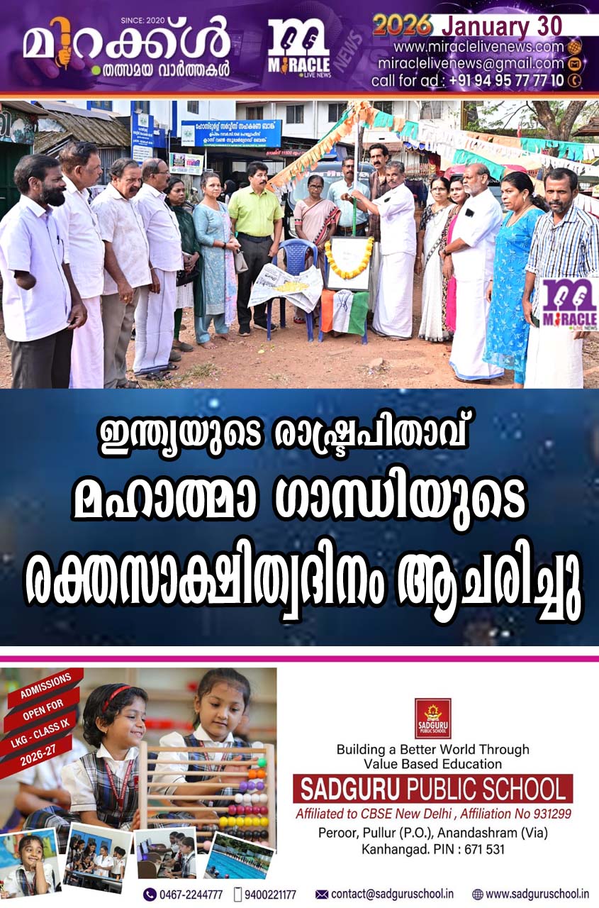 കാഞ്ഞങ്ങാട് മണ്ഡലം കോണ്ഗ്രസ് കമ്മറ്റിയുടെ നേതൃത്വത്തില് മാന്തോപ്പ് മൈതാനിയില് ഇന്ത്യയുടെ രാഷ്ട്രപിതാവ് മഹാത്മാ ഗാന്ധിയുടെ രക്തസാക്ഷിത്വ ദിനമായ ഇന്ന് പുതിയ കോട്ട മാന്തോപ്പ് മൈതാനിയില് മണ്ഡലം പ്രസിഡണ്ട് പി.വി. ചന്ദ്രശേഖരന് പതാക ഉയര്ത്തി മഹാത്മാവിന്റെ ഛായ ചിത്രത്തില് പുഷ്പാര്ച്ചനയും തുടര്ന്ന് നടന്ന അനുസ്മരണ യോഗം നടന്നു.ബ്ലോക്ക് കോണ്ഗ്രസ് വൈസ് പ്രസിഡണ്ട് എം.കുഞ്ഞികൃഷ്ണന് ഉദ്ഘാടനം ചെയ്തു.