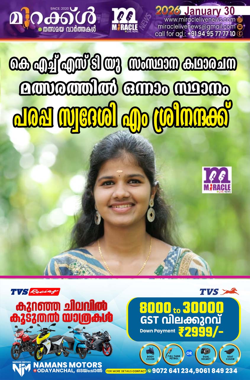 കാഞ്ഞങ്ങാട്: ഹയര്‍ സെക്കണ്ടറി അധ്യാപകരുടെ സംഘടനയായ കെ എച്ച് എസ് ടി യു 25 ആം വാര്‍ഷിക സമ്മേളനത്തോട് അനുബന്ധമായി നടത്തിയ സംസ്ഥാന കഥാരചന മത്സരത്തില്‍ പരപ്പ സ്വദേശി എം ശ്രീനന്ദക്ക്