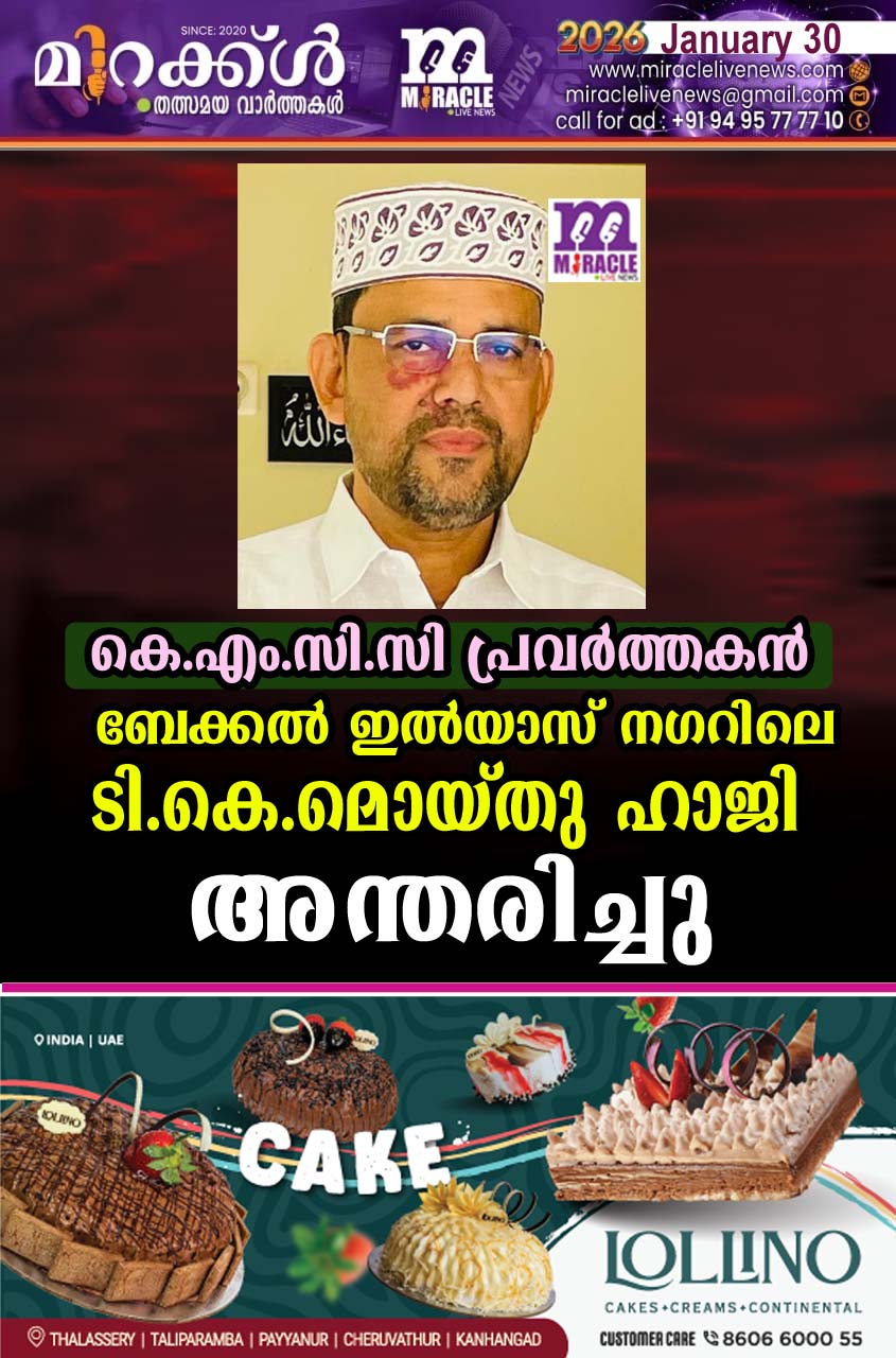 ബേക്കല്: ഇല്യാസ് നഗറിലെ ടി.കെ.മൊയ്തു ഹാജി (55) അന്തരിച്ചു. ഇല്യാസ് മുസ്ലിം ജമാഅത്ത് കമ്മിറ്റി ട്രഷററും, അബൂദാബി കമ്മിറ്റി മുന് പ്രസിഡന്റുമായിരുന്നു.അബൂദാബി കെ.എം.സി.സി പ്രവര്ത്തകനും, ജീവകാരുണ്യ പ്രവര്ത്തനങ്ങളിലെ സജീവ സാന്നിദ്ധ്യവുമായിരുന്നു.ഭാര്യ: ബീവി (ചെരുമ്പ).മക്കള്: മുബീന്, മുബീന, മുബശ്ശിര്, മുഫീദ, ഇസ്മായില്. മരുമക്കള്: ഹാഷിര് (ചിത്താരി) , അശ്ഫ (കുമ്പള ). സഹോദരങ്ങള്: ടി.കെ.ഹാരിസ് ഹാജി, ടി.കെ. ഇല്യാസ്, ടി.കെ.ഹസൈനാര്, ടി.കെ.മുനീര്, ബീവി, പരേതരായ ടി.കെ.മുഹമ്മദ് കുഞ്ഞി ഹാജി, ടി.കെ.മജീദ്.