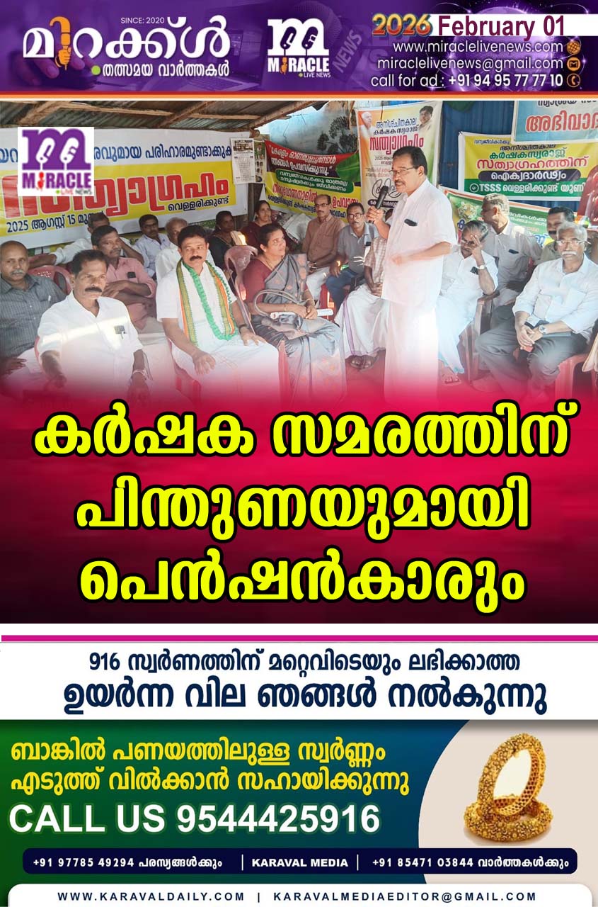 വെള്ളരിക്കുണ്ട്. : വന്യജീവികള്ക്കുമാത്രമല്ല മനുഷ്യര്ക്കും ജീവിക്കണം എന്ന മുദ്രാവാക്യവുമായി ഇക്കഴിഞ്ഞ സ്വാതന്ത്ര്യദിനം മുതല് വെള്ളരിക്കുണ്ടില് നടന്നു വരുന്ന കര്ഷകസ്വരാജ് സത്യാഗ്രഹത്തിന് പിന്തുണയുമായി കേരള സ്റ്റേറ്റ് സര്വ്വീസ് പെന്ഷണേര്സ് അസ്സോസ്സിയേഷന് പരപ്പമണ്ഡലം കമ്മിറ്റിയംഗങ്ങള് സത്യഗ്രഹ പന്തലിലെത്തി. സംഘടനയുടെ മണ്ഡലം സെക്രട്ടറി കൂടിയായ ബളാല് ഗ്രാമപഞ്ചായത്തംഗം സി.വി ശ്രീധരന് കര്ഷകസ്വരാജ് സത്യാഗ്രഹത്തിന്റെ ഭാഗമായി നടത്തിവരുന്ന 24 മണിക്കൂര് ഉപവാസത്തോട് ഐക്യദാര്