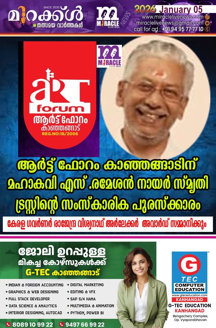 ജനുവരി 7 ന് ഉച്ചക്ക് 2.30 ന് കാഞ്ഞങ്ങാട് എമിറേറ്റ്സ് ഓഡിറ്റോറിയത്തില് നടക്കുന്ന ചടങ്ങില്