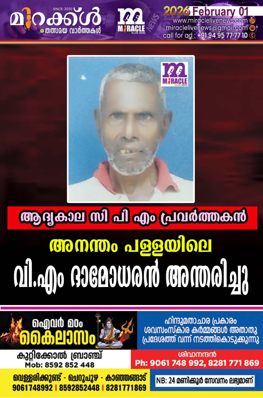 പടന്നക്കാട്:ആദ്യകാല സി പി എം പ്രവര്ത്തകന് അനന്തം പള്ളയിലെ വി.എം ദാമോധരന് (75) അന്തരിച്ചു. ഭാര്യ: കാര്ത്ത്യായനി. മക്കള്: ശശി,മിനി സി പി എം അനന്തം പള്ള ബ്രാഞ്ച് അംഗം),അനീഷ്. മരുമകന്: വി എം.രാജീവന് (ദേശാഭിമാനി ഏജന്റ്), സഹോദരങ്ങള്: കല്യാണി (അച്ചാംതുരുത്തി), ഉമ്പിച്ചി (അനന്തം പള്ള),വി.എം കൃഷ്ണന് (സി പി എം അനന്തംപള്ള നോര്ത്ത് ബ്രാഞ്ച് സെക്രട്ടറി), വി.എം.ഭാസ്ക്കരന് (അനന്തംപള്ള), കാര്ത്ത്യായനി (പുതുക്കൈ).