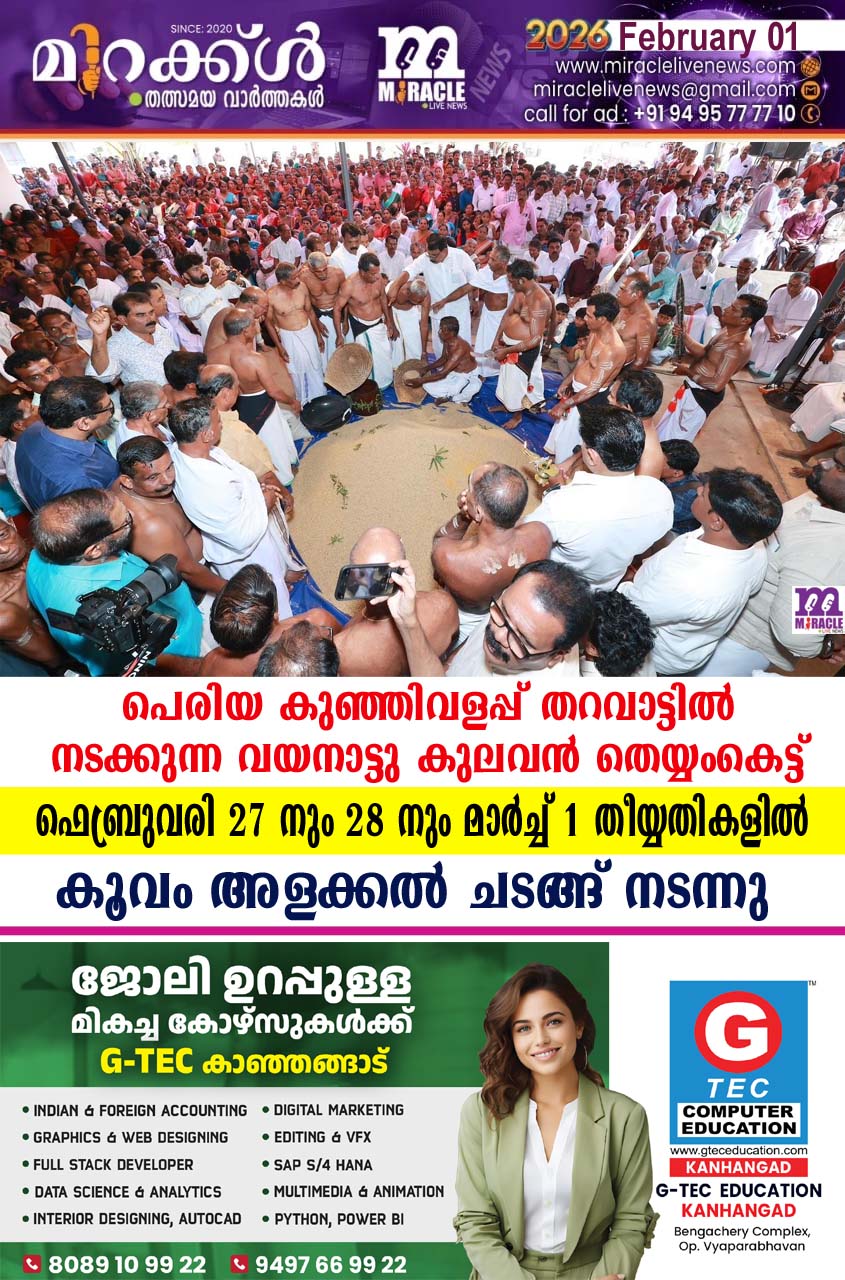 പെരിയ: പെരിയ കുഞ്ഞിവളപ്പ് തറവാട്ടില് നടക്കുന്ന വയനാട്ടു കുലവന് തെയ്യംകെട്ടിന് മുന്നോടിയായി കൂവം അളക്കല് ചടങ്ങ് നടന്നു. ആചാരസ്ഥാനികരുടെയും ആഘോഷ കമ്മിറ്റി ഭാരവാഹികളുടെയും ഭക്തജനങ്ങളുടെയും സാനിധ്യത്തില് പ്രധാന ക്ഷേത്രങ്ങളിലേക്കും ദേവസ്ഥാനങ്ങളിലേക്കും തറവാടുകളിലേക്കും നിവേദ്യത്തിനുള്ള നെല്ല് അളന്ന് മാറ്റി. കുണ്ടംകുഴി പഞ്ചലിംഗേശ്വര ക്ഷേത്രം , തൃക്കണ്ണാട് ത്രയംബകേശ്വര ക്ഷേത്രം, കീഴൂര് ധര്മ്മ ശാസ്താ ക്ഷേത്രം ,മണിയന്തട്ട മഹാവിഷ്ണു ക്ഷേത്രത്തിലേക്കും സമീപ ദേവസ്ഥാനങ്ങളിലേക്കും തറവാടുകളിലേക്കുമാ ണ് കൂവം അളന്നത്. പതിക്കാല് കുമാരന് കൂവം അളക്കുന്നതിന് നേതൃത്വമേകി. തുടര്ന്ന് പെരിയ കര്ണ്ണ മൂര്ത്തി , പെരിയ മിങ്ങുന്നോന്, കലൈപ്പാടി എന്നിവര്ക്ക് ആചാരവിധി പ്രകാരം തെയ്യം കെട്ടിനുള്ള അടയാളം കൊടുത്തു. ഫെബ്രുവരി 27 നും 28 നും മാര്ച്ച് ഒന്നിനുമാണ് വയനാട്ടുകുലവന് തെയ്യം കെട്ട് മഹോത്സവം നടക്കുന്നത്.