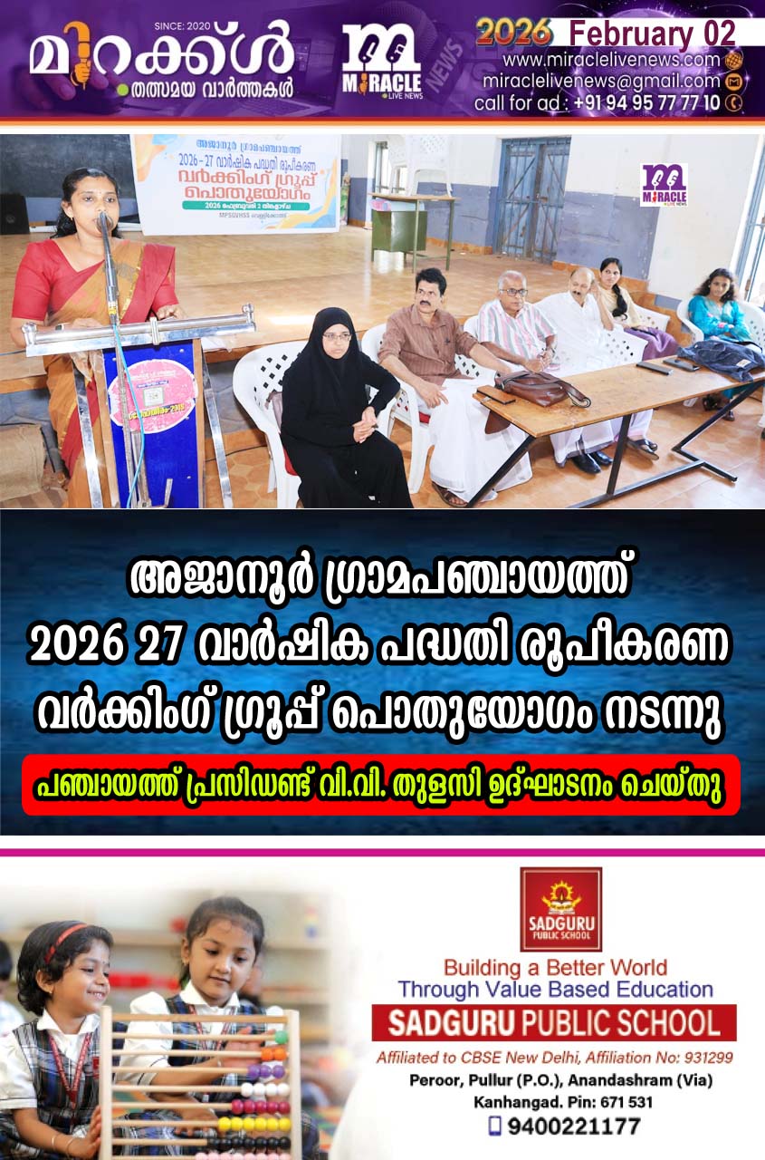 വെള്ളിക്കോത്ത് : അജാനൂര്‍ ഗ്രാമ പഞ്ചായത്തിന്റെ 202526 വര്‍ഷത്തെ വാര്‍ഷിക പദ്ധതി വര്‍ക്കിംഗ് ഗ്രൂപ്പ് രൂപീകരണ പൊതുയോഗം യോഗം വെള്ളിക്കോത്ത് മഹാകവി പി സ്മാരക ഗവണ്‍മെന്റ് വൊക്കേഷണല്‍ ഹയര്‍ സെക്കന്‍ഡറി സ്‌കൂളില്‍ നടന്നു. പഞ്ചായത്ത് പ്രസിഡണ്ട് വി. വി. തുളസി ഉദ്ഘാടനം ചെയ്തു. വൈസ് പ്രസിഡണ്ട് മൂലക്കണ്ടം പ്രഭാകരന്‍ അധ്യക്ഷനായി. വികസനകാര്യ സ്റ്റാന്‍ഡിങ് കമ്മിറ്റി ചെയര്‍പേഴ്‌സണ്‍ പി.കാവ്യ, ക്ഷേമകാര്യ സ്റ്റാന്‍ഡിങ് കമ്മിറ്റി ചെയര്‍പേഴ്‌സണ്‍ സി.കുഞ്ഞാമിന, വിദ്യാഭ്യാസ കാര്യ സ്റ്റാന്‍ഡിങ് കമ്മിറ്റി ചെയര്‍മാന്‍ എം. വി. രാഘവന്‍, ബ്ലോക്ക് പഞ്ചായത്ത് മെമ്പര്‍മാരായ പി. കെ. മഞ്ജിഷ, അബ്ദുല്‍ കരീം, കെ.ബിന്ദു, രതീഷ് വെള്ളം തട്ട തുടങ്ങിയവര്‍ സംസാരിച്ചു. പഞ്ചായത്ത് സെക്രട്ടറി ടി ഷൈജു സ്വാഗതവും പദ്ധതികളുടെ കരട് റിപ്പോര്‍ട്ടും അവതരിപ്പിച്ചു. തുടര്‍ന്ന് 14 വര്‍ക്കിംഗ് ഗ്രൂപ്പുകള്‍ വെവ്വേറെ യോഗം ചേരുകയും പദ്ധതികള്‍ ചര്‍ച്ച ചെയ്യുകയും രൂപീകരിക്കുകയും ചെയ്തു ക്രോഡീകരണം നടത്തി. വര്‍ക്കിംഗ് ഗ്രൂപ്പ് പൊതുയോഗത്തില്‍ ഉരുത്തി