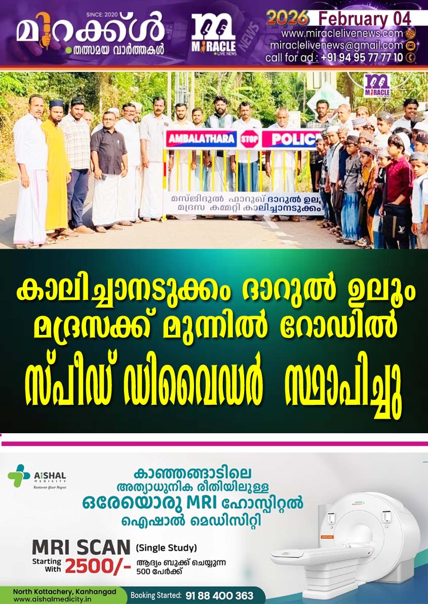 കാലിച്ചാനടുക്കം : ദാറുല് ഉലൂം മദ്രസ വിദ്യാര്ത്ഥികള് റോഡ് മുറിച്ച് കടക്കുന്നതിന് വേണ്ടി മദ്റസയുടെ മുന്നില് സ്ഥാപിച്ച സ്പീഡ് ബാരിയര് കോടോം ബേളൂര് ഗ്രാമ പഞ്ചായത്ത് പ്രസിഡന്റ് ടി വി ജയചന്ദ്രന് നാടിന് സമര്പ്പിച്ചു.