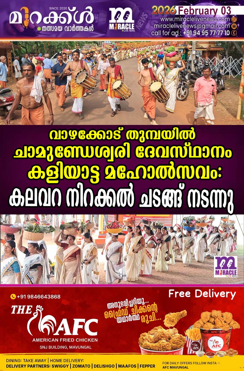 കോട്ടപ്പാറ :വാഴക്കോട് തുമ്പയില്‍ ചാമുണ്ഡേശ്വരി ദേവ സ്ഥാനം കളിയാട്ട മഹോല്‍സവത്തിന്റെ ഭാഗമായി വാഴക്കോട് സുബ്രഹ്മണ്യസ്വാമി ക്ഷേത്ര പരിധിയിലെ വിവിധ പ്രാദേശിക സമിതിയുടെ നേതൃത്വത്തില്‍