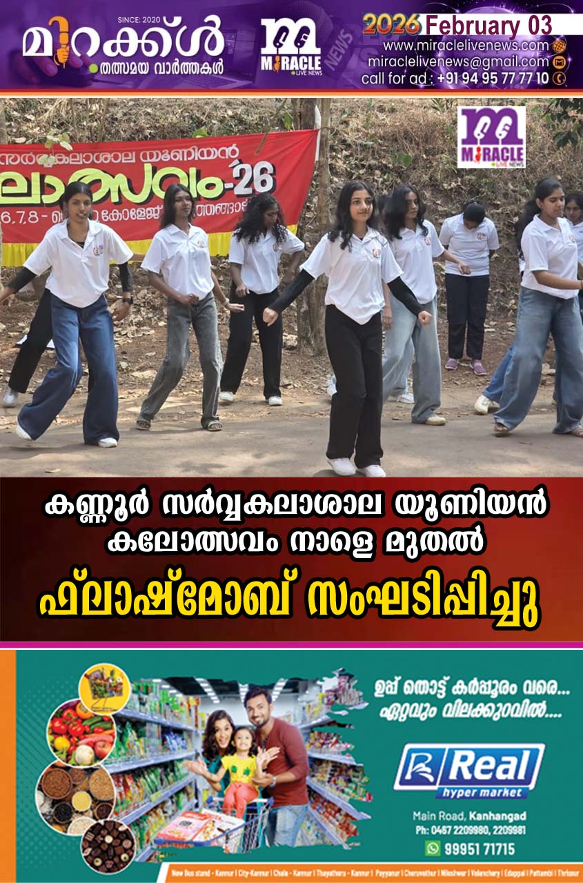 പടന്നക്കാട്: കണ്ണൂര് സര്വ്വകലാശാല യൂണിയന് കലോത്സവം നാളെ മുതല് 8 വരെ നെഹ്റു കോളേജ് പടന്നക്കാട് വെച്ച് നടക്കും. കലോത്സത്തിന്റെ പ്രരണാര്ത്ഥം കോളേജിലെ വിദ്യാര്ത്ഥിളെ ഉള്പ്പെടുത്തി പബ്ലിസിറ്റി കമ്മിറ്റിയുടെ നേതൃത്വത്തില് ഫ്ലാഷ്മോബ് സംഘടിപ്പിച്ചു.അശ്വിന് രാജ്, കെ അര്ജുന് തുടങ്ങിയവര് നേതൃത്വം നല്കി.
