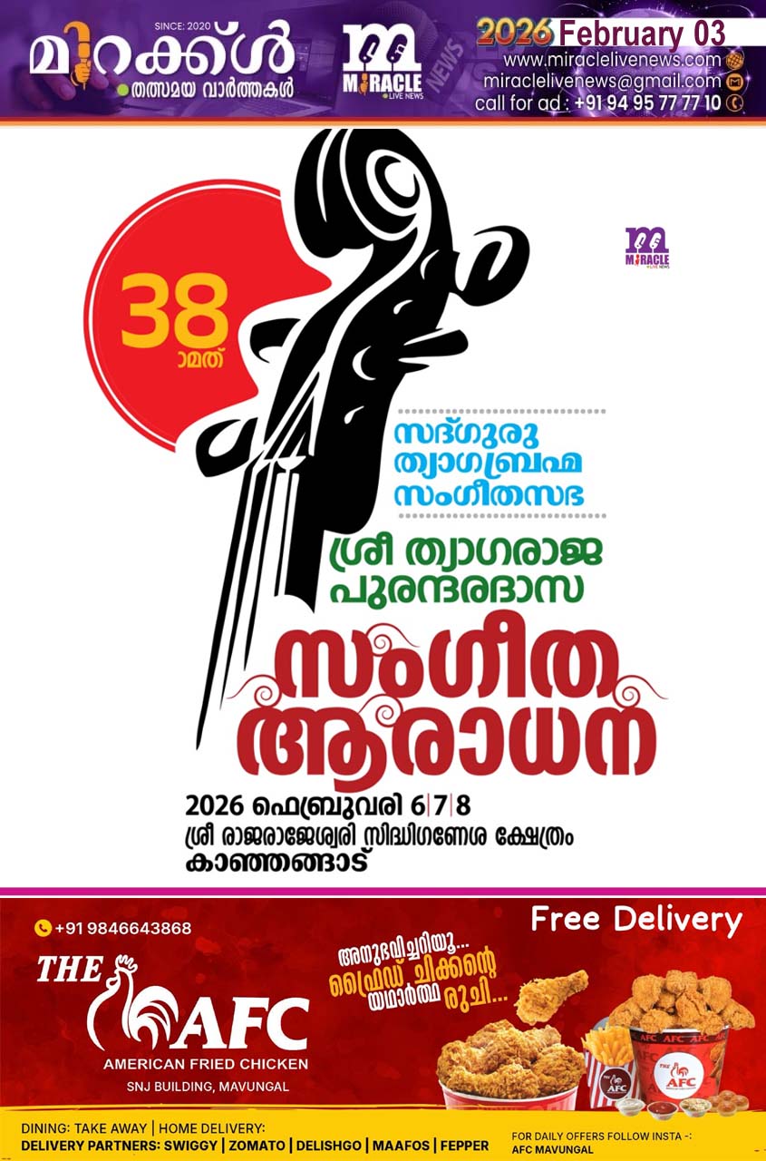 കാഞ്ഞങ്ങാട്: ത്യാഗരാജ പുരന്ദരദാസ സംഗീതോത്സവം 6ന് തുടങ്ങും. കാഞ്ഞങ്ങാട് രാജരാജേശ്വരി സിദ്ധിഗണേശ ക്ഷേത്രത്തില് വൈകീട്ട് 5ന് ചിന്മയ മിഷന് സംസ്ഥാന മേധാവി സ്വാമി വിവിക്താനന്ദ സരസ്വതി ഉദ്ഘാടനം ചെയ്യും. തുടര്ന്നുള്ള ഉദ്ഘാടന കച്ചേരിയില് വിവേക് സദാശിവം പാടും. ആലങ്കോട് വി.എസ്. ഗോകുല്, ബി.എസ്.പ്രശാന്ത് ബെംഗളൂരു, വിഷ്ണു.വി.കമ്മത്ത് എന്നിവര് പക്കമേളമൊരുക്കും. 7ന് രാവിലെ 9ന് സംഗീതാരാധന. വൈകീട്ട് 4ന് ശ്രീനിധി കെ.ഭട്ട് പാടും. 5.30ന് വസുധ രവിയുടെ പ്രധാനകച്ചേരി. ഗണരാജ് കാര്ലെ, പാലക്കാട് കെ.എസ്.മഹേഷ് കുമാര്, തിരുവനന്തപുരം ആര്.രാജേഷ് എന്നിവര് പക്കമേളം. സമാപന ദിനമായ 8ന് രാവിലെ 7ന് ത്യാഗരാജ സ്വാമികള് ഭിക്ഷ തേടി നടന്നതിനെ അനുസ്മരിച്ച് ഉഞ്ഛവൃത്തി. 9ന് പഞ്ചരത്ന കീര്ത്തനം. 10ന് സംഗീതാരാധന. വൈകീട്ട് 4ന് പയ്യന്നൂര് കെ.വി.ജഗദീശന് പാടും. 5.30ന് പ്രധാനകച്ചേരിയില് അഭിലാഷ് ഗിരിപ്രസാദ് പാടും. തിരുവനന്തപുരം ഡോ. എന്.സമ്പത്ത്, മന്നാര്ഗുഡി എ.ഈശ്വരന്, വെള്ളാറ്റഞ്ഞൂര് ശ്രീജിത്ത് എന്നിവര് പക്കമൊരുക്കും. തുടര്ന്ന് നടക്കുന്ന ആഞ്ജനേയോത്സവത്തോടെ സമാപനമാകും. കാഞ്ഞങ്ങാട് സദ്ഗുരു ത്യാഗബ്രഹ്മ സംഗീതസഭ സംഘടിപ്പിക്കുന്ന തുടര്ച്ചയായ 38ാമത് സംഗീതോത്സവമാണ് ഇത്.