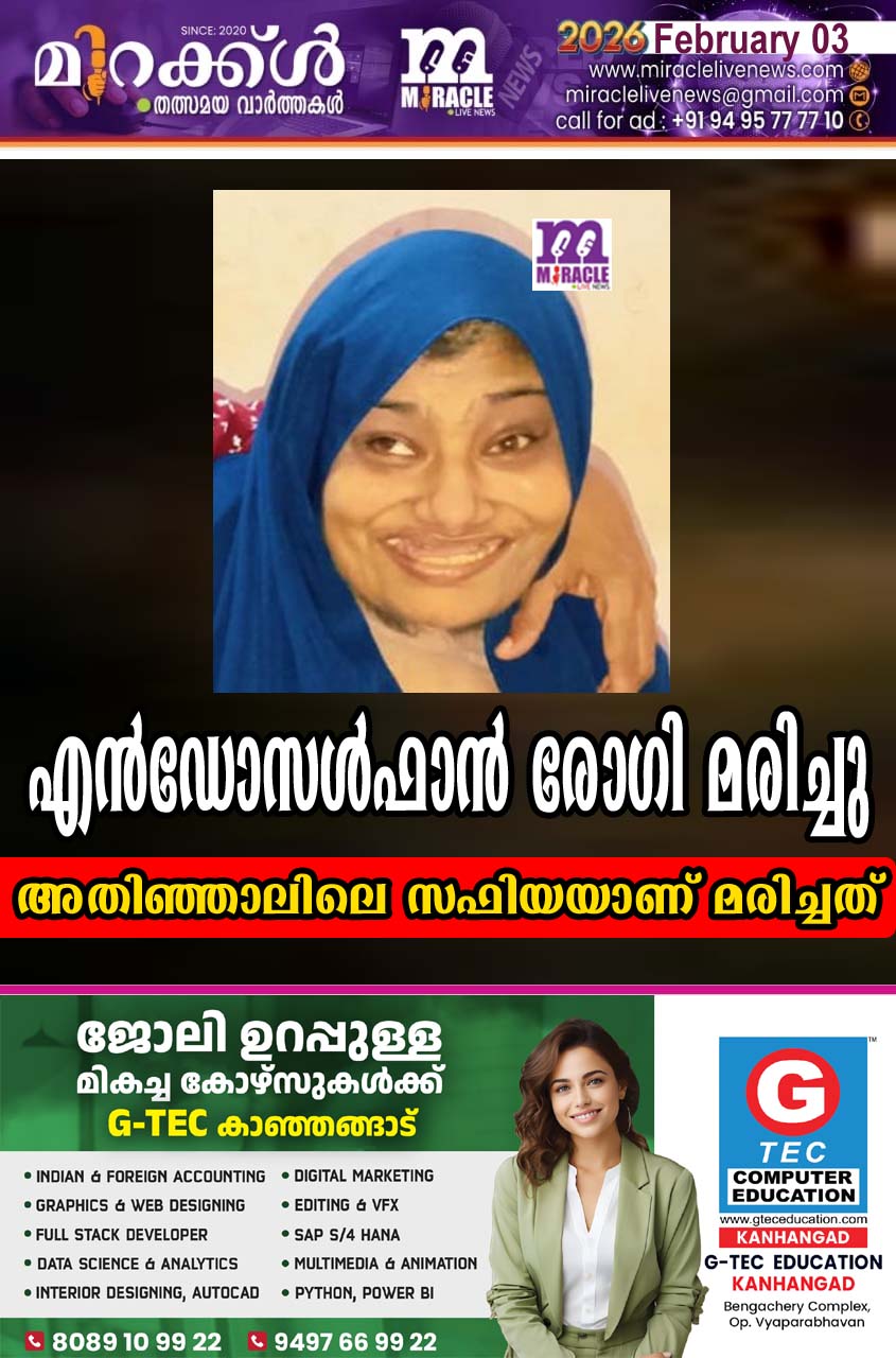 കാഞ്ഞങ്ങാട്: എന് ഡോസള്ഫാന് രോഗിയായ യുവതി മരിച്ചു. അതിഞ്ഞാലി ലെ സഫിയ(40) ആണ് മരിച്ചത്. പക്കിക്കാടത്ത് മൊയ്തുകൈച്ചുമ്മ ദമ്പതികളുടെ മകളാണ്. സഹോദരങ്ങള്: മുഹമ്മദലി (അബുദാബി), ഫാത്തിമ, റംസീന, കുഞ്ഞാമി, നസീഹത്ത്.