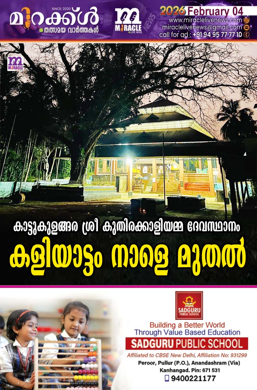 മാവുങ്കാല്: ഫെബ്രവരി 5 മുതല് 8 വരെ കാട്ടുകുളങ്ങര കുതിരക്കാളിയമ്മ ദേവസ്ഥാനത്ത് കളിയാട്ടത്തിന് നാളെ തുടക്കം.രാവിലെ രാവിലെ 10ന് മാവുങ്കാല് ശ്രീരാമ ക്ഷേത്ര പരിസരത്ത് നിന്ന് കലവറ ഘോഷയാത്ര.