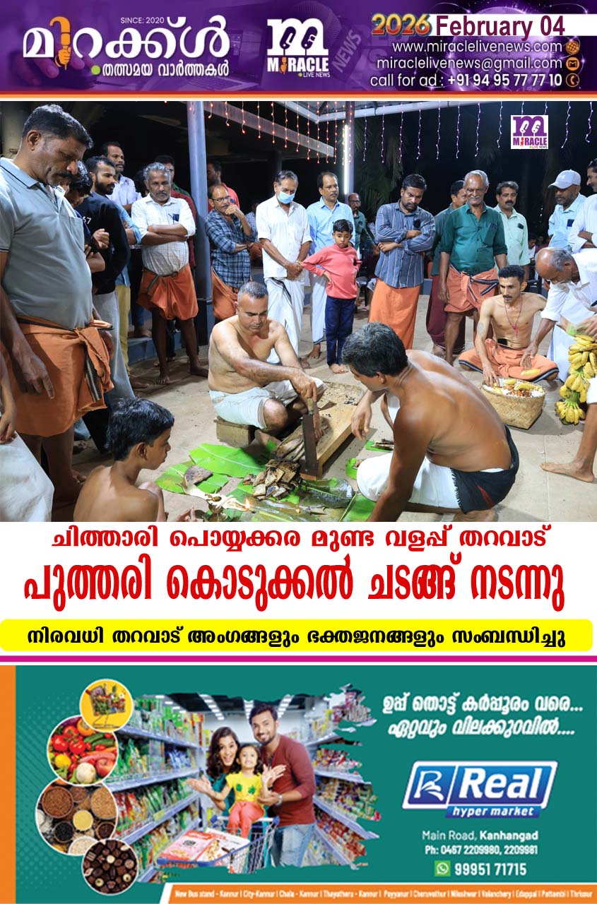 കാഞ്ഞങ്ങാട്: ചിത്താരി പൊയ്യക്കര മുണ്ട വളപ്പ് തറവാട് പ്രതിഷ്ഠാദിനവും പുത്തരി കൊടുക്കല്‍ ചടങ്ങും ഭക്തിസാന്ദ്രമായ അന്തരീക്ഷത്തില്‍ നടന്നു. ചാമുണ്ഡിക്കുന്ന് വിഷ്ണു ചാമുണ്ഡേശ്വരി ദേവസ്ഥാന സ്ഥാനികരുടെയും വെളിച്ചപ്പാടന്മാരുടെയും മഹനീയ സാന്നിധ്യത്തിനാണ് ചടങ്ങുകള്‍ നടന്നത്. പരമ്പരാഗത രീതിയില്‍ വയനാട്ടുകുലവന്‍ തറവാടുകളില്‍ അട ചുട്ടെടുക്കുന്നതുംഅവ മുറിച്ചെടുത്ത് വിതരണം ചെയ്യുന്നതും ഏറെ പ്രത്യേകതയുള്ളതാണ്. തറവാട് പ്രസിഡണ്ട് പാണ്ടിക്കണ്ടം മോഹനന്‍, സെക്രട്ടറി മുണ്ട വളപ്പില്‍ കുഞ്ഞി കൃഷ്ണന്‍, ഖജാന്‍ജി അജിത് കുമാര്‍ കുന്നരു വത്ത്, തറവാട് മൂപ്പന്‍ മിലിട്ടറി കൃഷ്ണന്‍ കല്ലിങ്കാല്‍ എന്നിവര്‍ നേതൃത്വം നല്‍കി. തറവാട്ട് അംഗങ്ങളും നാട്ടുകാരും അടക്കം നിരവധി ഭക്തജനങ്ങള്‍ പങ്കാളികളായി.