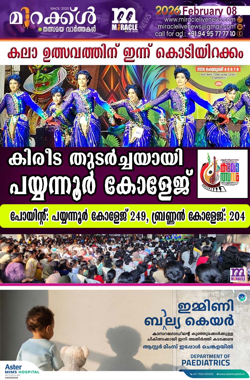 കാഞ്ഞങ്ങാട്: അഞ്ചു ദിനരാത്രങ്ങള്ക്ക് ഉല്സവാന്തരീക്ഷം സമ്മാനിച്ച കണ്ണൂര് സര്വ്വകലാശാല കലോത്സവത്തിന് ഞായറാഴ്ച സമാപനമാകും. ഇന്ന് അഞ്ച് വേദികളിയായി സ്റ്റേജിന മല്സരങ്ങളായ നാടന് പാട്ട്, കാഥാപ്രസംഗം, ഒപ്പന, മൈം, സ്കിറ്റ്, മാപ്പിളപ്പാട്ട്, തെരുവ് നാടകം എന്നിവ പൂര്ത്തിയാവുന്നതോടെയാണ് കലോത്സവം അവസാനിക്കുക