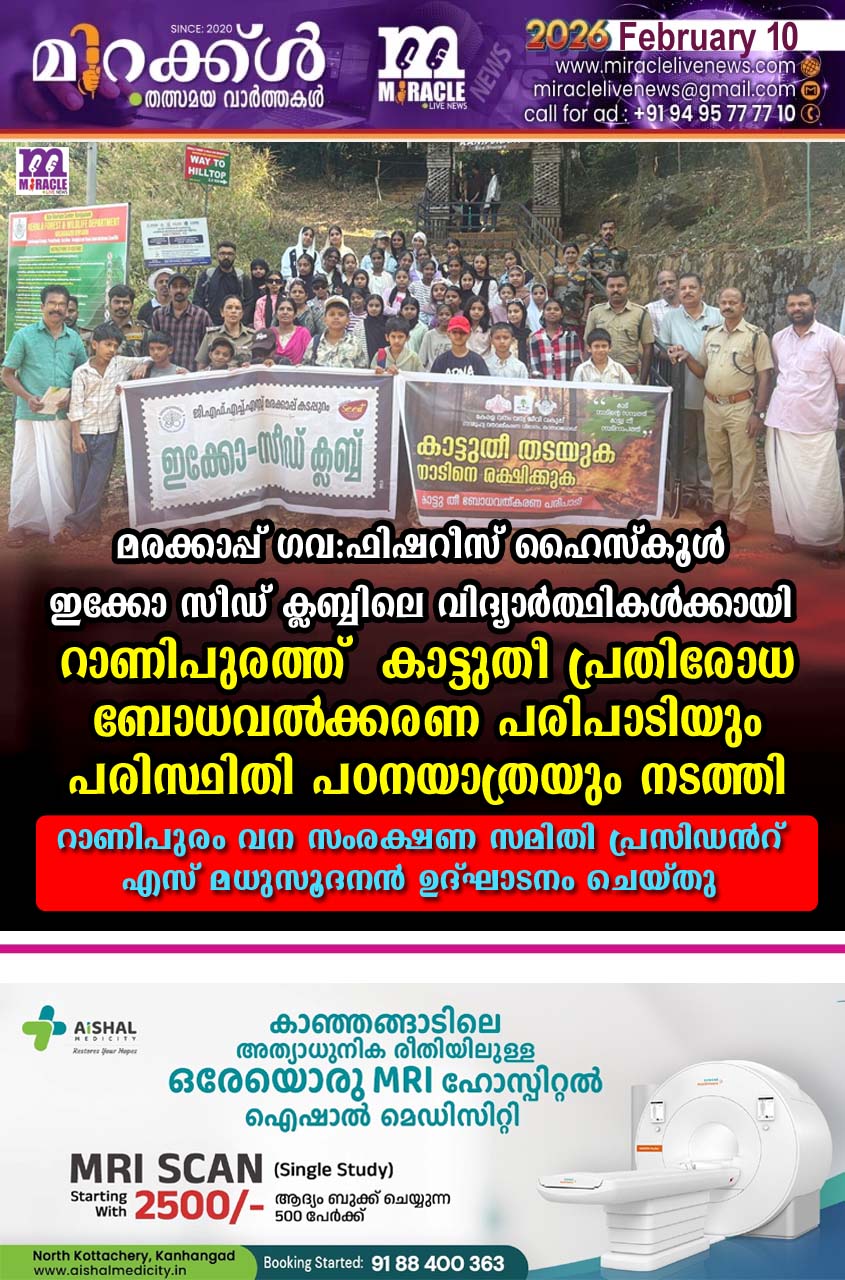 മരക്കാപ്പ് ഗവ:ഫിഷറീസ് ഹൈസ്‌കൂള്‍ ഇക്കോ സീഡ് ക്ലബ്ബിലെ വിദ്യാര്‍ത്ഥികള്‍ക്കായി റാണിപുരത്ത് കാട്ടുതീ പ്രതിരോധ ബോധവല്‍ക്കരണ പരിപാടിയും പരിസ്ഥിതി പഠനയാത്രയും നടത്തി; റാണിപുരം വന സംരക്ഷണ സമിതി പ്രസിഡന്റ് എസ് മധുസൂദനന്‍ ഉദ്ഘാടനം ചെയ്തു