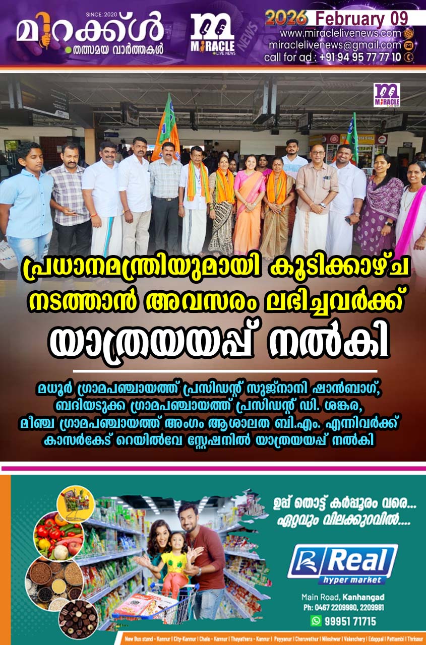 ആദരണീയ പ്രധാനമന്ത്രിയുമായി കൂടിക്കാഴ്ച നടത്താന്‍ അവസരം ലഭിച്ച നൂറംഗ ജനപ്രതിനിധി സംഘത്തില്‍ ഉള്‍പ്പെട്ട മധൂര്‍ ഗ്രാമപഞ്ചായത്ത് പ്രസിഡന്റ് സുജ്‌നാനി ഷാന്‍ബാഗ്, ബദിയടുക്ക ഗ്രാമപഞ്ചായത്ത് പ്രസിഡന്റ് ഡി. ശങ്കര, മീഞ്ച ഗ്രാമപഞ്ചായത്ത് അംഗം ആശാലത ബി.എം. എന്നിവര്‍ക്ക് കാസര്‍ഗോഡ് റെയില്‍വേ സ്റ്റേഷനില്‍ യാത്രയയപ്പ് നല്‍കി. കാസര്‍ഗോഡ് നിന്നും ഇന്റര്‍സിറ്റി സൂപ്പര്‍ഫാസ്റ്റ് എക്‌സ്പ്രസില്‍ പാലക്കാട് ജംഗ്ഷന്‍ റെയില്‍വേ സ്റ്റേഷനില്‍ എത്തിയ ശേഷം അവിടെ നിന്നും കേരള എക്‌സ്പ്രസിലാണ് നൂറംഗ ജനപ്രതിനിധി സംഘം ഡല്‍ഹിയിലേക്ക് യാത്ര തിരിക്കുന്നത്. ബിജെപി സംസ്ഥാന പ്രസിഡന്റ് രാജീവ് ചന്ദ്രശേഖറാണ് ജനപ്രതിനിധി സംഘത്തെ നയിക്കുന്നത്. നരേന്ദ്ര മോദിജിയുടെ വസതിയിലും കേന്ദ്ര ന്യൂനപക്ഷ കാര്യ സഹമന്ത്രി ജോര്‍ജ്ജ് കുര്യന്റെ വസതിയിലും ഇവര്‍ക്ക് വിരുന്നു നല്‍കും. പാര്‍ലമെന്റ്, ബിജെപി ദേശീയ ആസ്ഥാനം എന്നിവ സന്ദര്‍ശിക്കുന്നതോടൊപ്പം കേരളത്തിന്റെ വികസന വിഷയങ്ങള്‍ പ്രധാനമന്ത്രിയുമായി ചര്‍ച്ച ചെയ്യാനും പ്രതിനിധി സംഘത്തിന് അവസരം ലഭിക്കും. ബിജെപി കോഴിക്കോട് മേഖല പ്രസിഡന്റ് അഡ്വ. കെ. ശ്രീകാന്ത്, ബിജെപി കാസര്‍ഗോഡ് ജില്ലാ പ്രസിഡന്റ് എം.എല്‍. അശ്വിനി, ബദിയടുക്ക, മധൂര്‍ ഗ്രാമപഞ്ചായത്ത് ജനപ്രതിനിധികള്‍, ബിജെപി പ്രവര്‍ത്തകര്‍ എന്നിവര്‍ യാത്രയയപ്പ് നല്‍കാനെത്തിയിരുന്നു.
