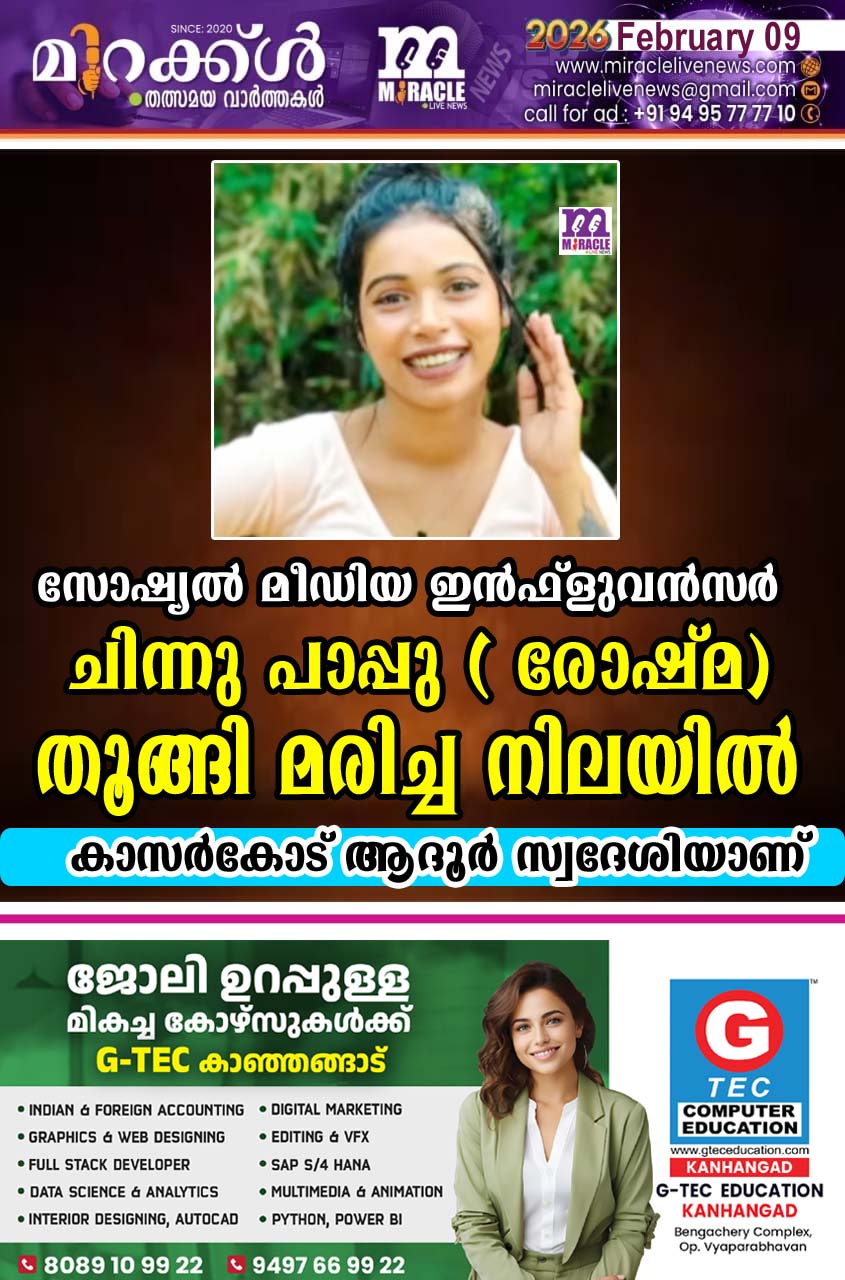 കാസര്കോട്: സോഷ്യല് മീഡിയ ഇന്ഫ്ലുവന്സറായ കാസര്കോട് ആദൂര് സ്വദേശി കെ. രോഷ്മ