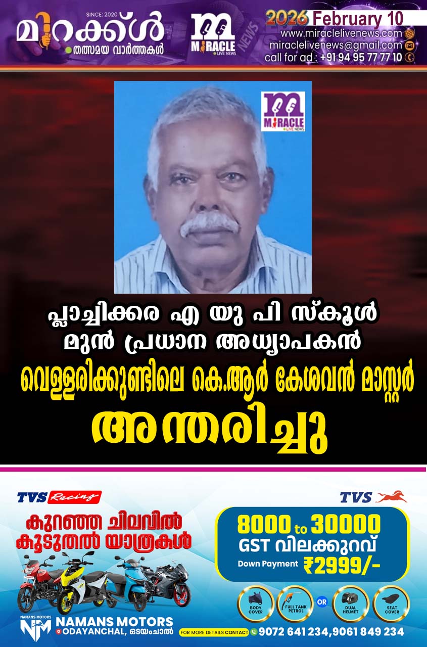 വെള്ളരികുണ്ട്: പ്ലാച്ചിക്കര എ യുപി സ്കൂള് മുന് പ്രധാന അധ്യാപകന് വെള്ളരിക്കുണ്ടിലെ കെ.ആര് കേശവന് മാസ്റ്റര് (88) അന്തരിച്ചു.ശവസംസ്കാരം ബുധന് രാവിലെ 9.30 ന് വെള്ളരിക്കുണ്ടിലെ വീട്ട് വളപ്പില്