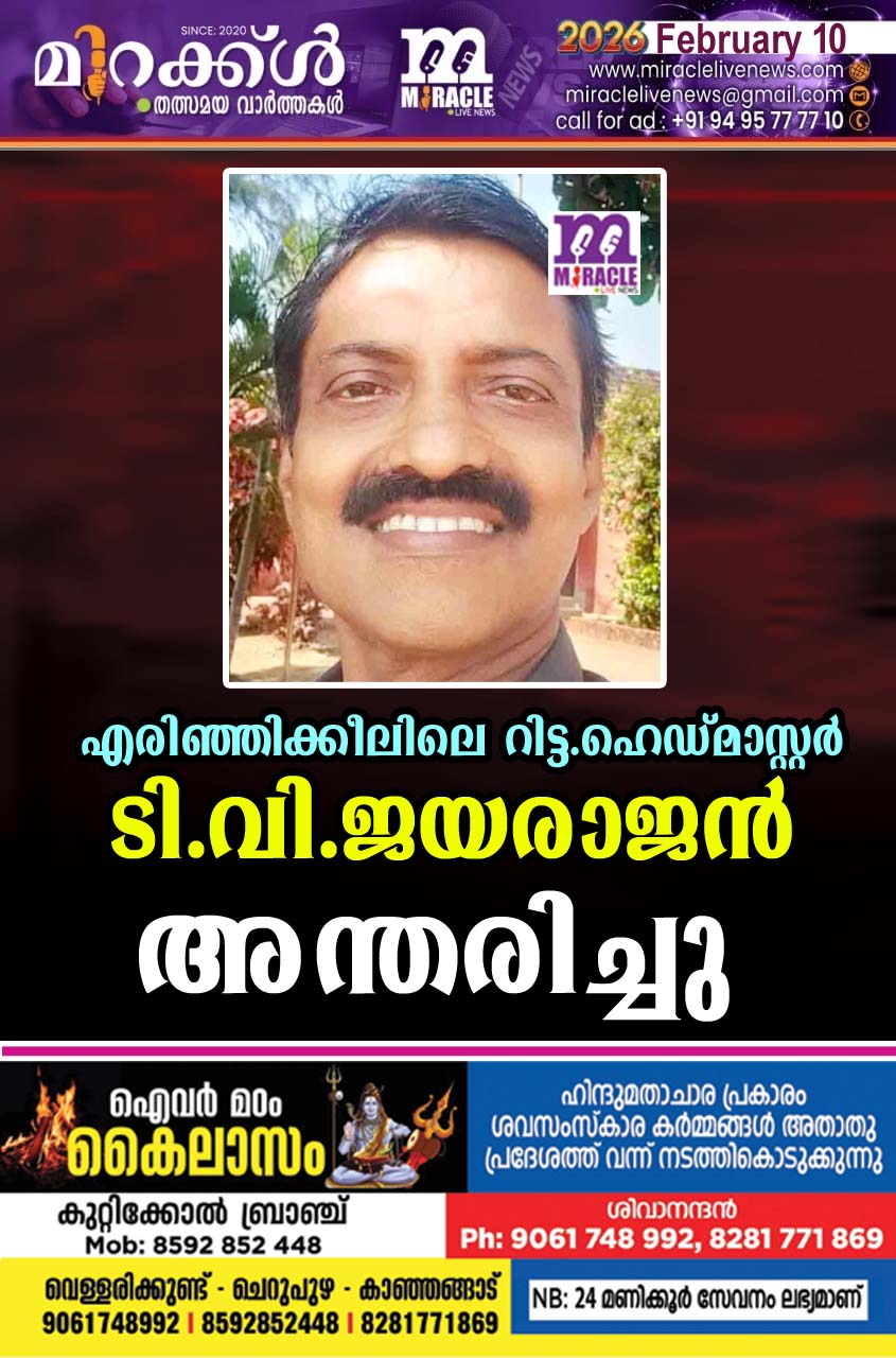 നീലേശ്വരം: എരിഞ്ഞിക്കീലിലെ റിട്ട ഹെഡ്മാസ്റ്റര് ടി.വി. ജയരാജന് (58) അന്തരിച്ചു. (പരുത്തിക്കാമുറി ഗവ: എല്.പി.സ്കൂള് കൊയാമ്പുറം) സര്വോദയ മണ്ഡലം കാസര്കോട് ജില്ല, മദ്യ വിരുദ്ധ സമിതി കാസര്കോട് ജില്ല ഗാന്ധിയന് പഠന കേന്ദ്രം കാസര്കോട് ജില്ല, കാന് ഫെഡ് കാസര്കോട് ജില്ല, തുരുത്തി കൈരളി വായനശാല പ്രസിഡന്റ്, തുരുത്തി ശ്രീനാരായണ സാംസ്കാരിക കേന്ദ്രം മുന് പ്രസിഡന്റ് എന്നിവയുടെ സജീവ പ്രവര്ത്തകനാണ്. പരേതനായ ടി എം അമ്പുഞ്ഞി മാസ്റ്ററുടെയും ടി.വി പാറുക്കുട്ടിയുടെയും മകനാണ്. ഭാര്യ : വി.കെ.സ്മിത. മക്കള് : ഡോ. ശില്പ ജയരാജ്, ശ്രേയ ജയരാജ്.സഹോദരങ്ങള്: ഷീജ (കാഞ്ഞങ്ങാട്), പരേതനായ ടി.വി.സുനില്കുമാര് (ശാസ്ത്ര കാസര്കോട്, ബീ.എച്ച് ആര് എഫ് കാസര്കോട്)