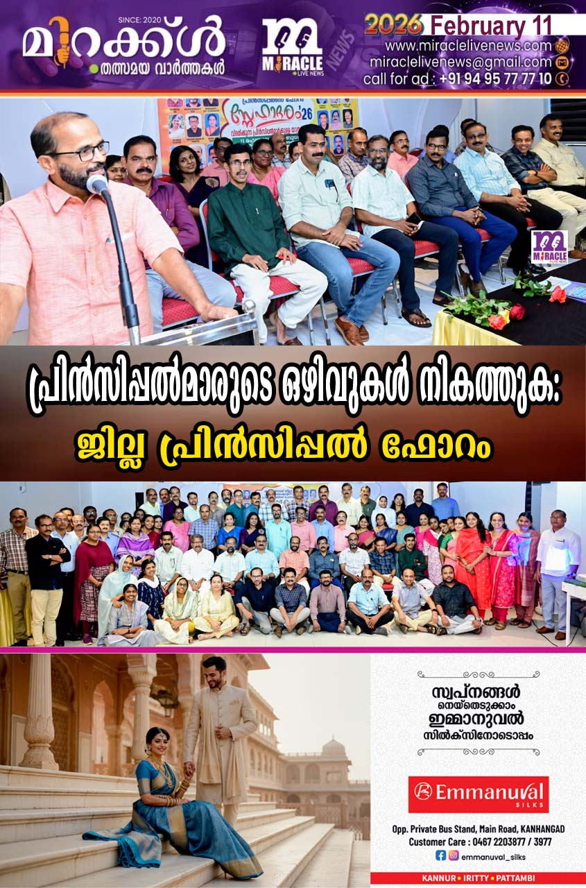 കാഞ്ഞങ്ങാട് :ജില്ലയില് ഒഴിവുള്ള പ്രിന്സിപ്പല് തസ്തിയില് ഉടന് നിയമനം നടത്തണമെന്ന് കാസര്കോട് ജില്ല പ്രിന്സിപ്പല് ഫോറം വാര്ഷിക ജനറല്ബോഡിയോഗം പ്രമേയത്തിലൂടെ ആവശ്യപ്പെട്ടു..വാര്ഷിക ജനറല്ബോഡി യോഗവും പ്രിന്സിപ്പാള് മാര്ക്കുള്ള യാത്രയയപ്പ് സമ്മേളനം വും കാഞ്ഞങ്ങാട് നഗരസഭ ചെയര്മാന് വി വി രമേശന് ഉദ്ഘാടനം ചെയ്തു. പ്രിന്സിപ്പല് ഫോറം പ്രസിഡണ്ട് ഡോ. എ.വി സുരേഷ് ബാബു അധ്യക്ഷനായി. ആര് ഡി ഡി എ കെ.വിനോദ് കുമാര് മുഖ്യാതിഥിയായി.. മലപ്പുറം ആര് ഡി ഡി.ബിയാട്രീസ് എ മരിയ,ജില്ലാ കോര്ഡിനേറ്റര് സി വി അരവിന്ദാക്ഷന് , ഡോ. എന് വേണു നാഥന് , ഡോ.ടി. ഗീത, എ വി സുധ ,എന് അബദുള്ലത്തീഫ് ,കെ. ദിവാകരന് എന്നിവര് സംസാരിച്ചു. വിരമിക്കുന്ന ഹയര് സെക്കന്ററി പരീക്ഷ വിഭാഗം ഡെപ്യൂട്ടി ഡയരക്ടര് കെ എച്ച് സാജന് . കോഴിക്കോട് ആര് ഡി ഡി ആര് രാജേഷ് കുമാര് ,അസി. കോര്ഡിനേറ്റര് പി.മോഹനന് , തുടങ്ങി 18 പ്രിന്സിപ്പാള് മാര്ക്ക് യാത്രയയപ്പ് നല്കി. പ്രിന്സിപ്പാള് ഫോറം സെക്രട്ടറി കെ.എന് രമേശ് സ്വാഗതവും ട്രഷറര് പി വി ലീന നന്ദിയും പറഞ്ഞു.