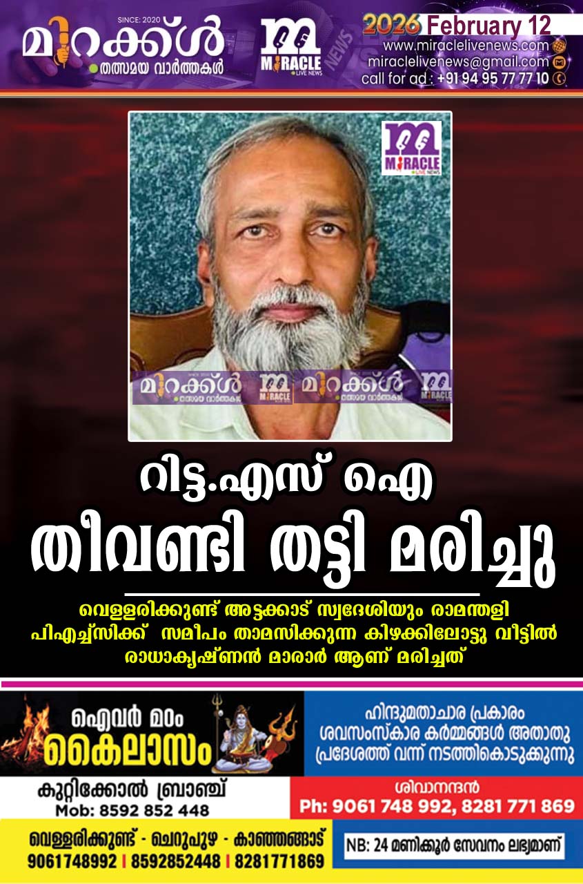 കിഴക്കിലോട്ടു വീട്ടില് രാധാകൃഷ്ണന് മാരാര് (63) ആണ് മരിച്ചത് . പയ്യന്നൂര് റെയില്വേ മേല്പാലത്തിന് സമീപത്തായിരുന്നു അപകടം. കണ്ണൂര് ഡിഐജി ഓഫീസിലെ റിട്ട.എസ്ഐയാണ്. വെള്ളരിക്കുണ്ട് അട്ടക്കാട് സ്വദേശിയായ രാധാകൃഷ്ണന് കാസര്കോട് ജില്ലയിലെ വിവിധ സ്റ്റേഷനുകളില് ജോലി ചെയ്തിട്ടുണ്ട്. കുറച്ചു നാളായി കാന്സര് ബാധിച്ചു ചികിത്സയിലായിരുന്നു. ആദ്യ ഭാര്യ മിനി 22 വര്ഷം മുമ്പ് കാങ്കോലിലുണ്ടായ വാഹനാ