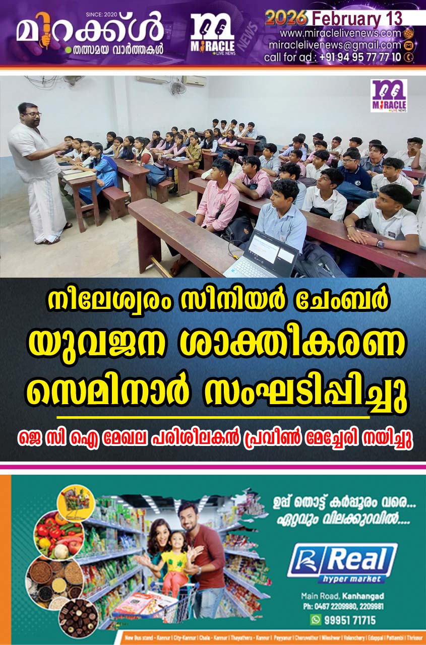 നീലേശ്വരം: യുവജനങ്ങളുടെ കഴിവുകള് കണ്ടെത്താനും വളര്ത്താനും ശരിയായ മാര്ഗ നിര്ദ്ദേശം നല്കുക എന്ന ലക്ഷ്യത്തോടെ , സീനിയര് ചേംബര് ഇന്റര്നാഷണല് നീലേശ്വരം ലീജിയന് യുവജന ശാക്തീകരണ സെമിനാര് സംഘടിപ്പിച്ചു. നീലേശ്വരം റോയല് കോളേജില് വെച്ച് നടന്ന പരിപാടി ദേശീയ സമിതി അംഗം എം നാരായണന് നായര് ഉദ്ഘാടനം ചെയ്തു. പ്രസിഡണ്ട് കെ ഗിരീഷ് കുമാര് അധ്യക്ഷനായി. സ്ഥാപക പ്രസിഡണ്ട് കെ രാമകൃഷ്ണന് മുഖ്യ പ്രഭാഷണം നടത്തി. ജെ സി ഐ ഇന്ത്യയുടെ മേഖല പരിശീലകനും, എന് എല് പി വെരിഫൈഡ് മാസ്റ്റര് പരിശീലകനുമായ പ്രവീണ് മേച്ചേരി സെമിനാറിന് നേതൃത്വം നല്കി. സെക്രട്ടറി പി കെ ദീപേഷ് സ്വാഗതവും ടി ജയചന്ദ്രന് നന്ദിയും പറഞ്ഞു.