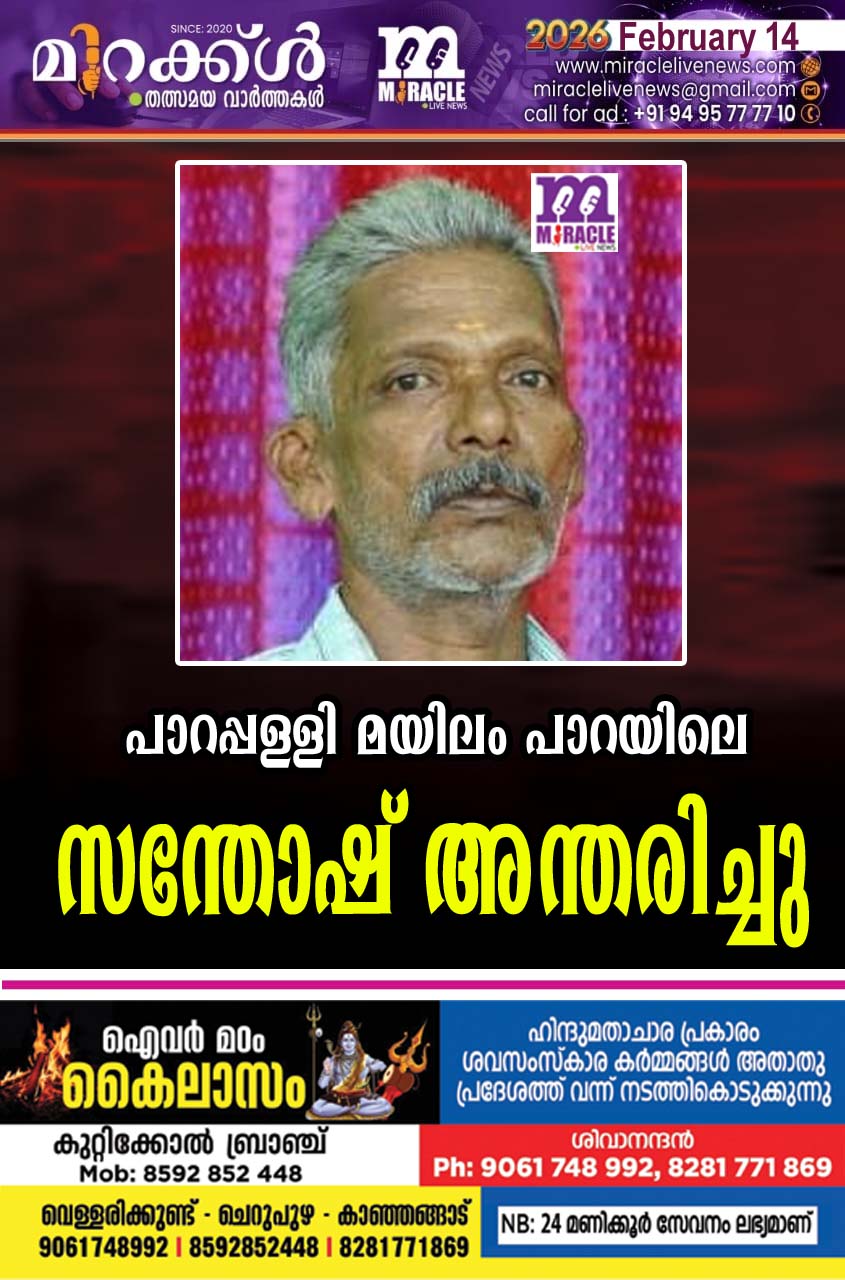 പാറപ്പള്ളി: മയിലം പാറയിലെ സന്തോഷ്(56) അന്തരിച്ചു. ഭാര്യ: സാവിത്രി (മലയാക്കോള്).മക്കള്: സന്ദീപ് (മാര്ക്കറ്റിംഗ് സെയില്സ്മാന് ), സനൂപ് (ഡ്രൈവര്), സുധീപ് , സ്വരൂപ് (ഇരുവരും കൊറിയര് സര്വീസ് ജീവനക്കാരന്),