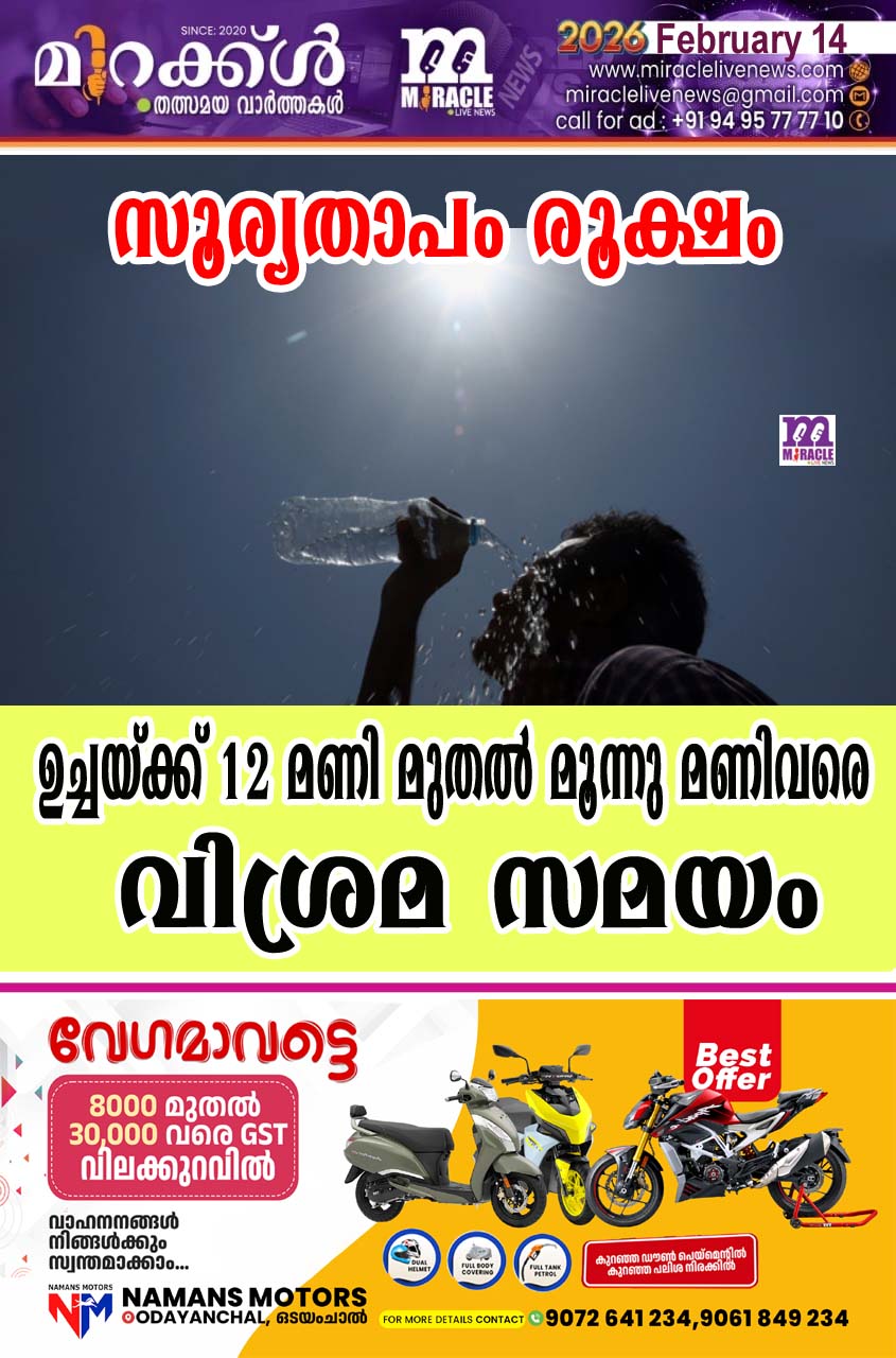 തിരുവനന്തപുരം: സൂര്യതാപം രൂക്ഷമായി കൊണ്ടിരിക്കെ, വെയിലത്ത് പണിയെടുക്കുന്ന തൊഴിലാളികളുടെ തൊഴില് സമയത്തില് സര്ക്കാര് ക്രമീകരണം ഏര്പ്പെടുത്തി. ഉച്ചയ്ക്ക് 12 മണി മുതല് വൈകിട്ട് മൂന്നുമണിവരെ ഇത്തരം തൊഴിലാളികള്ക്ക് വിശ്രമ സമയം അനുവദിച്ചു. പുതുക്കിയ തൊഴില് ക്രമീകരണം മേയ് 20 വരെ തുടരുമെന്ന് മുന്നറിയിച്ചിട്ടുണ്ട്. സംസ്ഥാനത്തു വേനല്ച്ചൂട് അതിരൂക്ഷമായി വര്ദ്ധിച്ചു കൊണ്ടിരിക്കുന്ന സാഹചര്യത്തിലാണ് ഈ നടപടി. വെയിലത്ത് പണിയെടുക്കുന്ന തൊഴിലാളികള്ക്ക് സൂര്യാഘാത മേല്ക്കാനുളള സാധ്യതയുണ്ടെന്ന് അധികൃതര് സംശയിക്കുന്നു. അതേസമയം, രാവിലെ ഏഴു മണി മുതല് വൈകുന്നേരം ഏഴു മണി വരെയുള്ള സമയത്തിനുള്ളില് തൊഴിലാളികള് വിശ്രമസമയം കഴിഞ്ഞു എട്ടു മണിക്കൂര് ജോലി ചെയ്യണമെന്ന് നിര്ദ്ദേശിച്ചിട്ടുണ്ട്. നിര്ദ്ദേശങ്ങള് പാലിക്കുന്നുണ്ടെന്ന് ഉറപ്പാക്കണമെന്നു ലേബര് കമ്മീഷണര് അറിയിച്ചു.