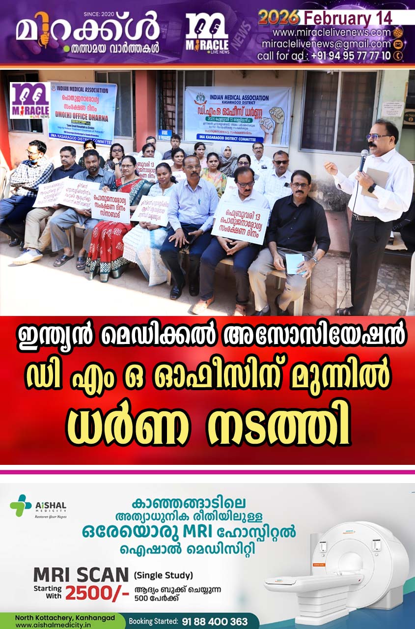 കാഞങ്ങാട് :ചെറുകിട ആശുപത്രികളെ സംരക്ഷിക്കുക, പൊതുജനങ്ങള്ക്ക് ചുരുങ്ങിയ ചെലവില് ചികില്സ ഉറപ്പാക്കുക ,15ല് താഴെ കിടക്കകള് ഉള്ള ചെറിയ ആശുപതികളെ ക്ലിനിക്കല് എസ്റ്റാബ്ളിഷ്മെന്റ് പരിധിയില് നിന്ന് ഒഴിവാക്കുക തുടങ്ങിയ ആവശ്യങ്ങള് ഉയര്ത്തി കൊണ്ട് കാസര്കോട് ജില്ലാ ഐ.എം.എ പൊതുജനാരോഗ്യ സംരക്ഷണ ദിനത്തില് ഡി.എം.ഒ ഓഫീസ് ധര്ണ്ണ നടത്തി. സെന്ട്രല് വര്ക്കിംഗ് കമ്മിറ്റി മെമ്പര് ഡോ.ബി.നാരായണ നായിക്ക് ധര്ണ ഉദ്ഘാടനം ചെയ്തു. ജില്ലാ കമ്മിറ്റി ചെയര്മാന് ഡോ. ജനാര്ദ്ദന നായിക് സി.എച്ച്.അധ്യക്ഷത വഹിച്ചു.