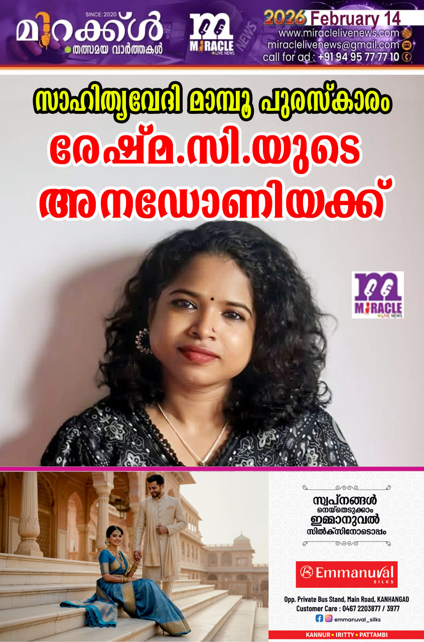 കാഞ്ഞങ്ങാട്: നെഹ്റു കോളേജ് സാഹിത്യവേദി പൂര്വ്വ വിദ്യാര്ത്ഥികള് നല്കിവരുന്ന അഞ്ചാമത് മാമ്പൂ പുരസ്കാരം കണ്ണൂര് പെരുമ്പടവ് സ്വദേശി സി രേഷ്മയുടെ അപ്രകാശിത കവിതാ സമാഹാരമായ അനഡോണിയക്ക്. 11111, രൂപയും ഷിബു സിഗ്നേച്ചര് രൂപകല്പ്പന ചെയ്ത ശില്പവും മാവിന് തൈയുമാണ് പുരസ്കാരം. ഡോ.ആര്. ചന്ദ്രബോസ്, കെ വി മണികണ്ഠദാസ്, പത്മനാഭന് ബ്ലാത്തൂര് എന്നിവരടങ്ങുന്ന ജൂറിയാണ് വിധി നിര്ണയിച്ചത്. ഫെബ്രുവരി 19, 20 തീയതികളില് നടക്കുന്ന കാഞ്ഞങ്ങാട് കാവ്യോത്സവത്തിന്റെ ഉദ്ഘാടന വേദിയില് പുരസ്കാരം കൈമാറും. കോഴിക്കോട് എന്.ഐ.ടി.യില് സിവില് എഞ്ചിനീയറിങ് ഗവേഷകയാണ് രേഷ്മ.