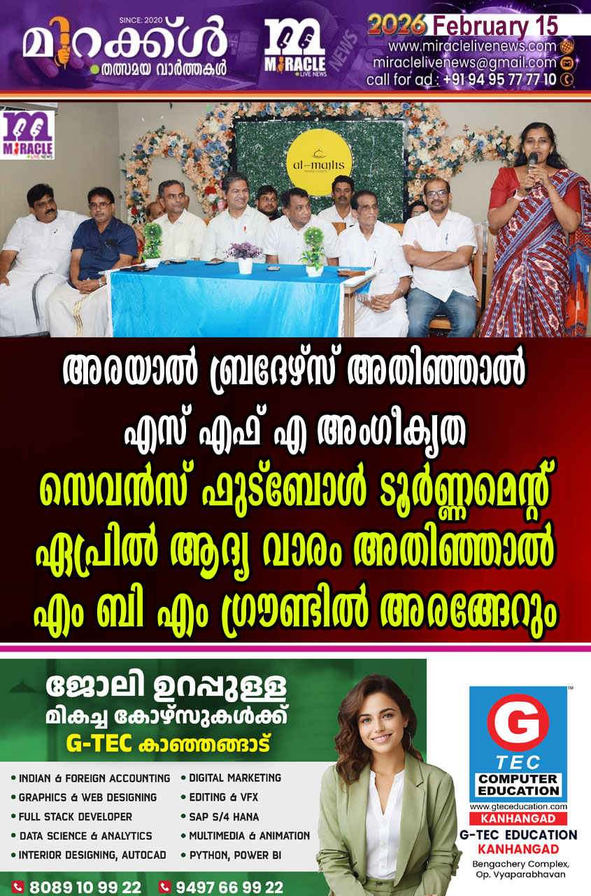 കാഞ്ഞങ്ങാട്: അരയാല് ബ്രദേഴ്സ് അതിഞ്ഞാല് ആതിഥ്യമരുളുന്ന എസ് എഫ് എ അംഗീകൃത സെവന്സ് ഫുട്ബോള് ടൂര്ണ്ണമെന്റ് ഏപ്രില് ആദ്യവാരത്തില് അതിഞ്ഞാല് എം ബി എം ഗ്രൗണ്ടില് സംഘടി പ്പിയ്ക്കും. സംസ്ഥാനത്തെ 20 ഓളം ടീമുകളെ പങ്കെടുപ്പിച്ച് കൊണ്ടാണ് ടൂര്ണ്ണമെന്റ് നടത്തപ്പെടുന്നത്.