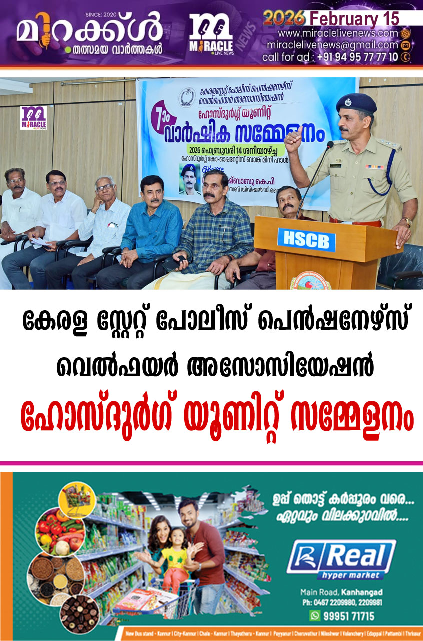കാഞ്ഞങ്ങാട്: കേരള സ്റ്റേറ്റ് പോലീസ് പെന്ഷനേഴ്സ് വെല്ഫയര് അസോസിയേഷന് ഹോസ്ദുര്ഗ് യൂണിറ്റ് 7ാം വാര്ഷിക സമ്മേളനം പുതിയ കോട്ട സഹകരണ ബാങ്ക് ഹാളില് വെച്ച് നടന്നു. കാഞ്ഞങ്ങാട് ഡി വൈ എസ് പി കെ പി സുരേഷ് ബാബു ഉദ്ഘാടനം ചെയ്തു.യൂണിറ്റ് പ്രസിഡന്റ് അസൈനാര് അധ്യക്ഷതനായി.