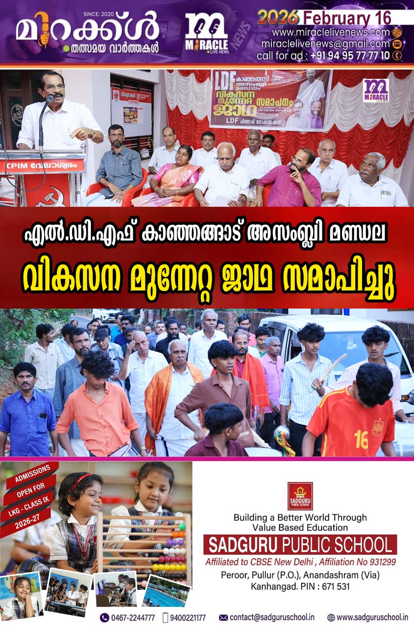 കാഞ്ഞങ്ങാട്:ഇടതുപക്ഷ ജനാധിപത്യ മുന്നണിയുടെ നേതൃത്വത്തില് കാഞ്ഞങ്ങാട് അസംബ്ലി മണ്ഡലത്തില് നടത്തിയ വികസന മുന്നേറ്റ ജാഥയുടെ സമാപനം നടന്നു. ഈ ചന്ദ്രശേഖരന് എംഎല്എ ലീഡറും കേരള കോണ്ഗ്രസ് എം സംസ്ഥാന ജനറല് സെക്രട്ടറി കുര്യാക്കോസ് പ്ലാപ്പറമ്പില് ഡെപ്യൂട്ടി ലീഡറും സി.പി.ഐ.എം ജില്ലാ സെക്രട്ടറിയേറ്റംഗം വി.വി. രമേശന് മാനേജരുമായ കാഞ്ഞങ്ങാട് ജാഥ പുതുക്കൈയില് നിന്നും ആരംഭിച്ച് ഒഴിഞ്ഞവളപ്പ്, കല്ലൂരാവി, അരയി, നെല്ലിക്കാട്ട്, കിഴക്കുംകര, വെള്ളിക്കോത്ത്, കൊളവയല്, രാവണേശ്വരം എന്നിവിടങ്ങളിലെ സ്വീകരണങ്ങള്ക്ക് ശേഷം വേലാശ്വ രത്ത് സമാപിച്ചു. വേലാശരത്ത് എത്തിച്ചേര്ന്ന ജാഥ അംഗങ്ങളെ വിവിധ സംഘടനകളുടെ നേതൃത്വത്തില് ഹാരാര്പ്പണം നടത്തി സ്വീകരിച്ച് ആനയിച്ചു. സമാപന സമ്മേളനം സിപിഐഎം മുന് ജില്ലാ സെക്രട്ടറി എം. വി. ബാലകൃഷ്ണന് ഉദ്ഘാടനം ചെയ്തു. കെ. ബിന്ദു അധ്യക്ഷയായി. ഇ. ചന്ദ്രശേഖരന് എം.എല്.എ കുര്യാക്കോസ് പ്ലാപ്പറമ്പില്, വി. വി. രമേശന്, കെ. രാജ് മോഹന് എന്നിവര് സംസാരിച്ചു. വി. കെ. രാജന് ഷാലു മാത്യു, ഒക്ലാവ് കൃഷ്ണന്, പി കെ നിഷാന്ത്, ഗോവിന്ദന് പള്ളിക്കാപ്പില്, കെ. എസ്. കുര്യാക്കോസ്, സി. കെ. നാസര്, പി. പി. രാജു, എം.പി. ജയേഷ്, ഉദിനൂര് സുകുമാരന്, രാഹുല് നിലാങ്കര കൂലേരി രാഘവന്, പി.അപ്പുക്കുട്ടന് എന്നിവര് വിവിധ കേന്ദ്രങ്ങളില് സംസാരിച്ചു. കൃഷ്ണന് കോടാട്ട് സ്വാഗതം പറഞ്ഞു.